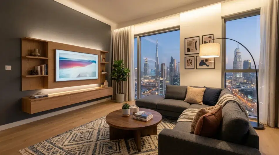 In apartments with open-plan layouts — common in Dubai Marina, Business Bay, Downtown, and most newer developments — the television is typically mounted on the wall at the far end of the living space. Avoid placing the TV where afternoon sunlight hits the screen directly; this is a surprisingly common oversight in west-facing apartments and results in screens that are unusable between 3–7 pm.