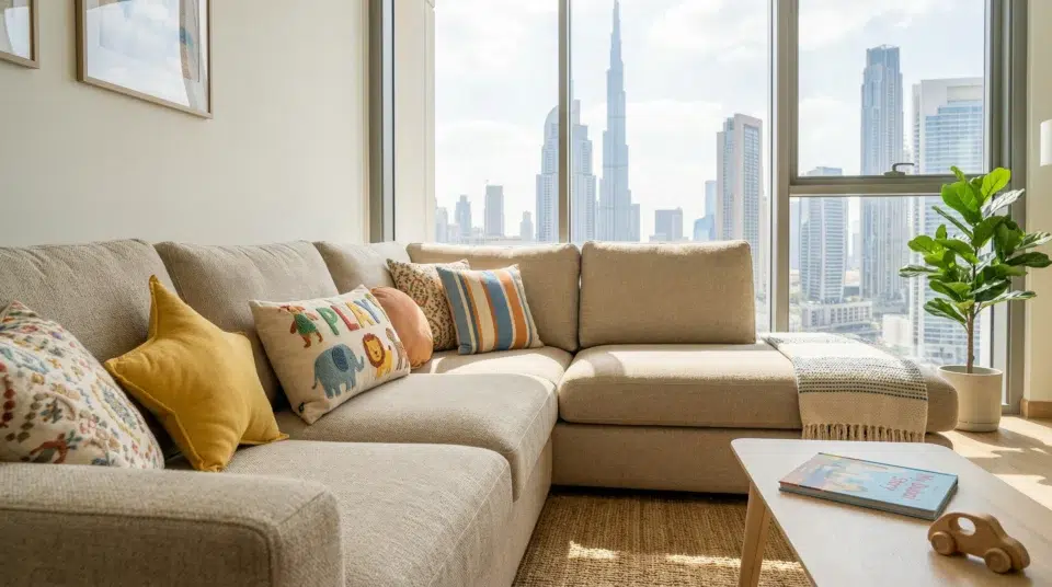 Corner sectionals for family villa living rooms are realistically priced from AED 4,500 at the entry level to AED 15,000+ for larger, better-constructed pieces. Be cautious of unusually cheap sectionals — the frame construction and foam density are where costs are genuinely cut, and a sofa that sags within two years is not a saving.