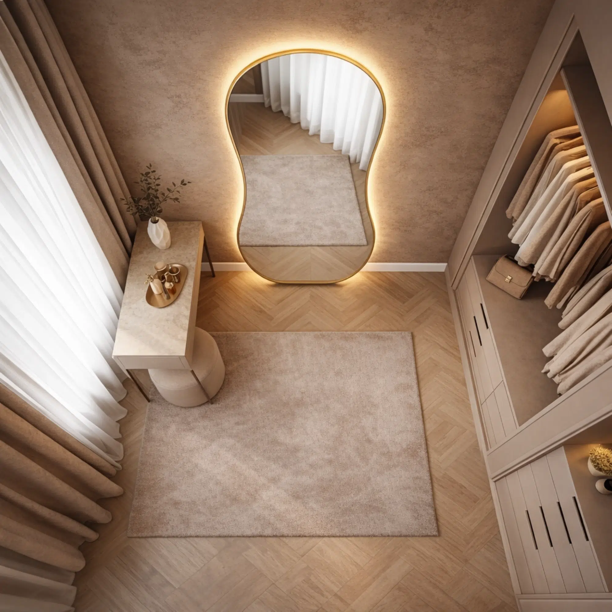 Additionally, the well-proportioned width ensures a comfortable viewing experience. Moreover, the smooth reflective surface provides clear visibility for daily grooming. Meanwhile, the sculptural shape adds subtle character without dominating the interior. Consequently, form and function remain well balanced.