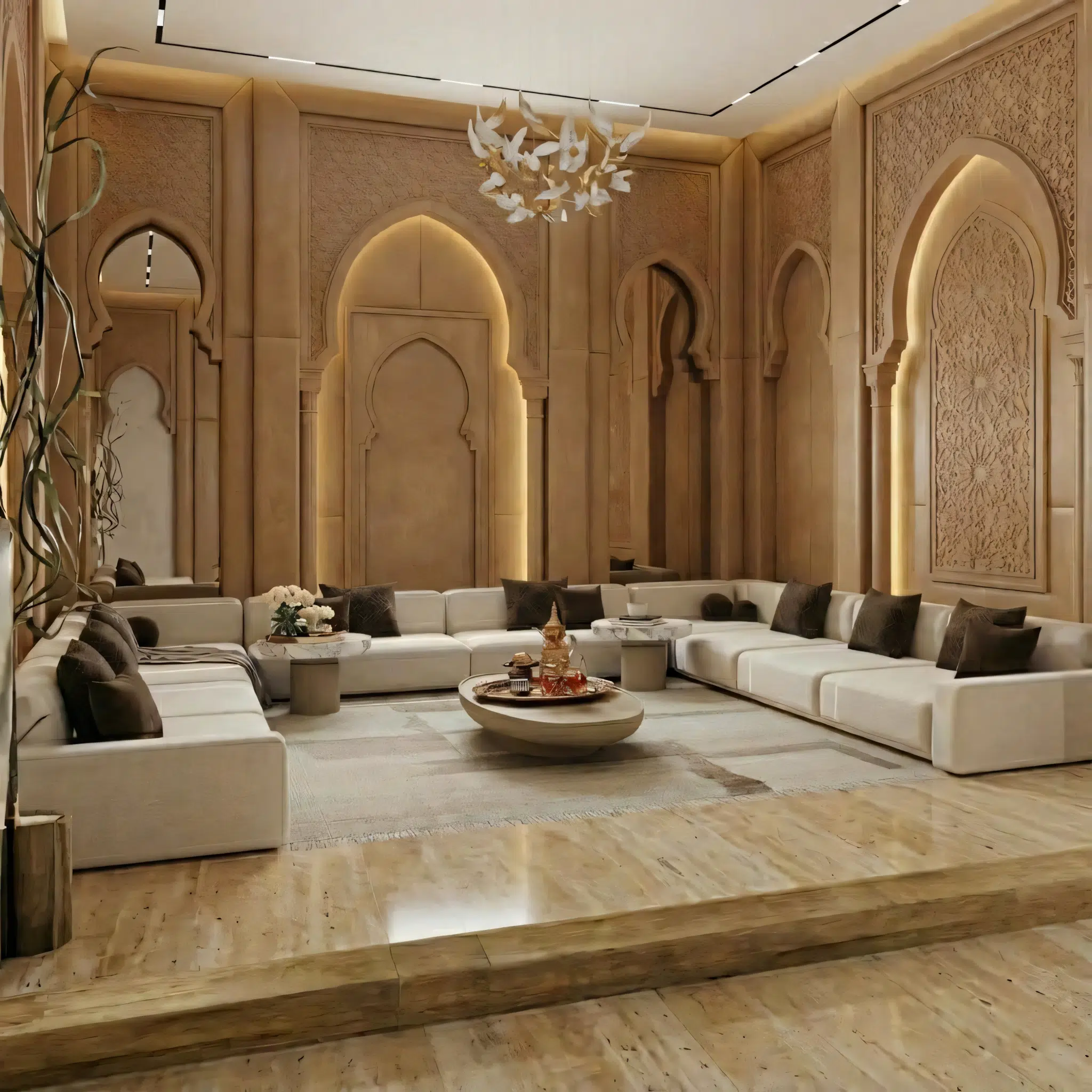 Meanwhile, the mix of classic and contemporary design creates a balanced visual style. Because of this, the elegant lines remain subtle, while the detailing stays simple and clean. As a result, the majlis setting feels modern yet connected to tradition.
