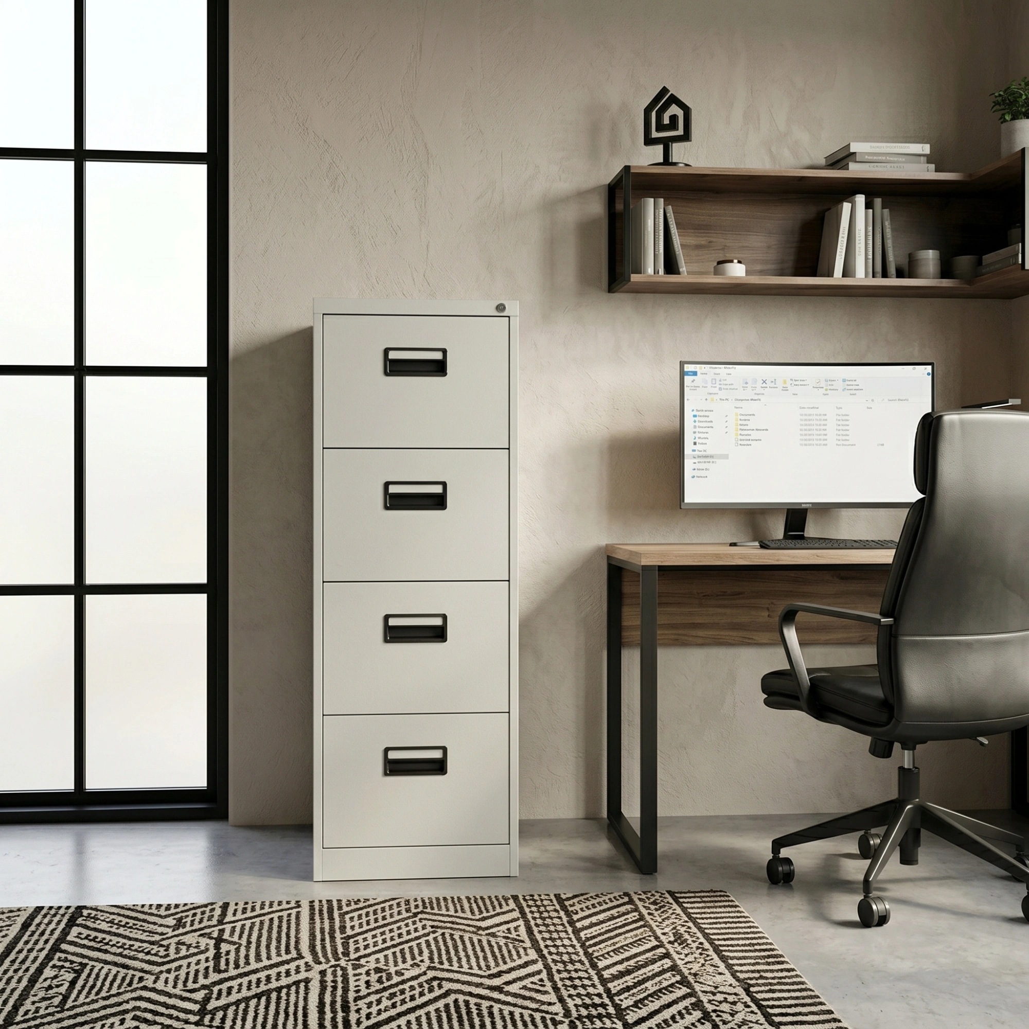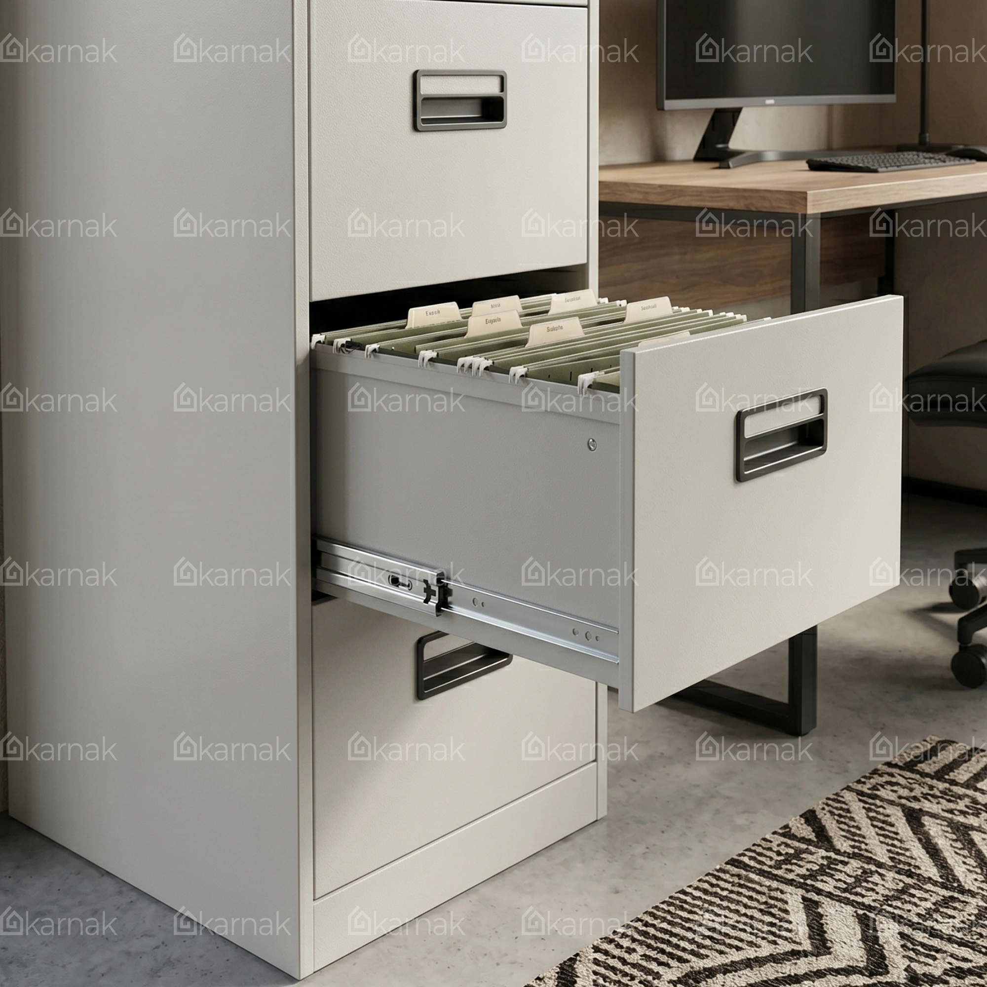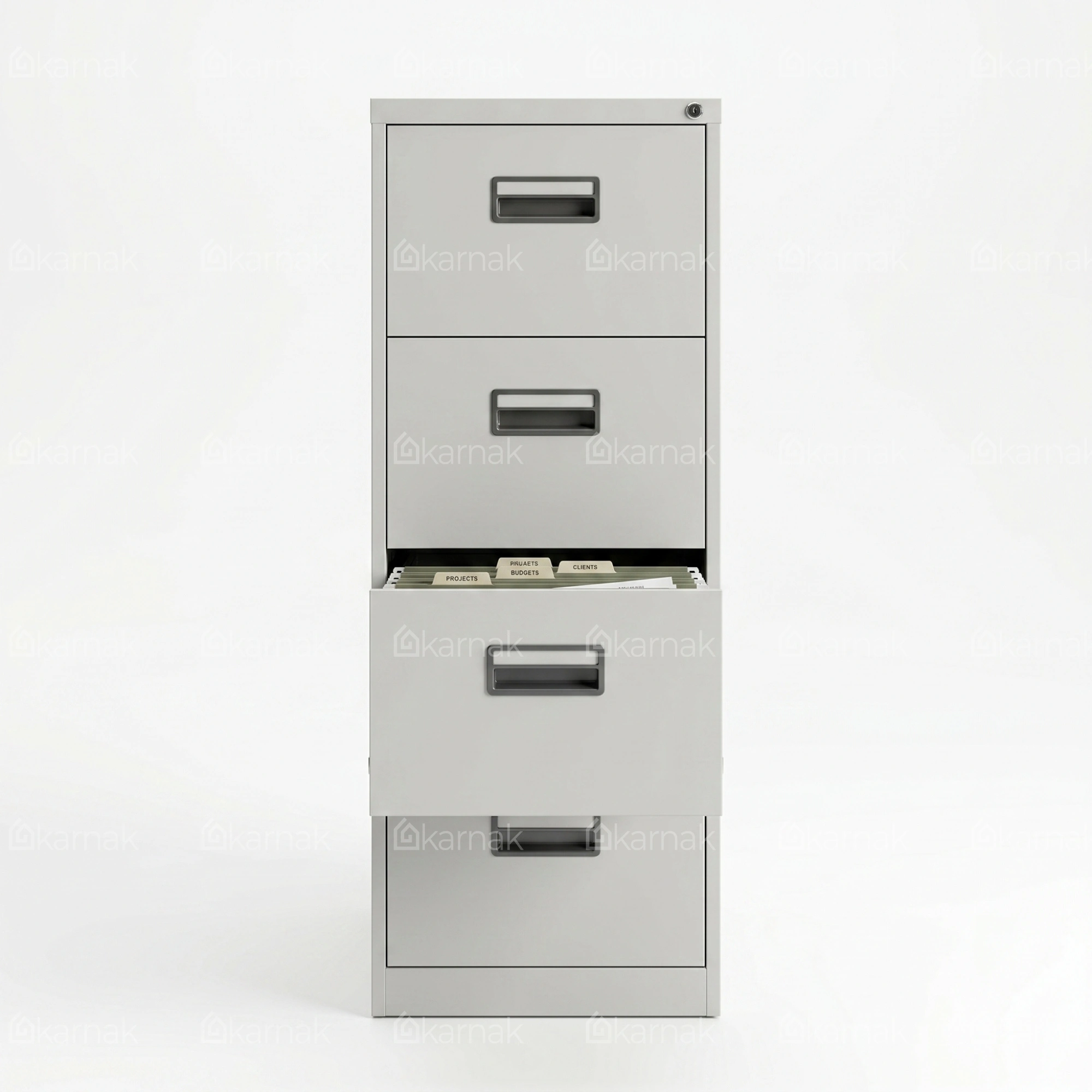 Overall, the 4 Drawer File Cabinet is designed to provide secure and organized storage for office documents and important records. Its tall vertical structure allows efficient document management while maintaining a compact footprint suitable for professional office environments. The cabinet helps keep files neatly arranged while ensuring easy access when required.