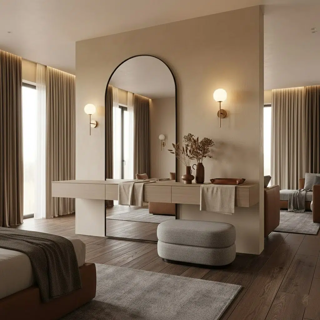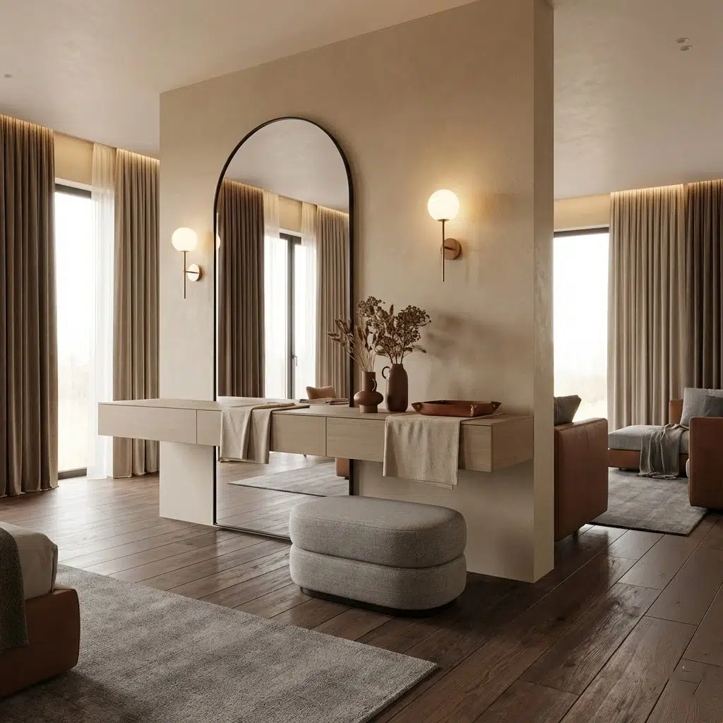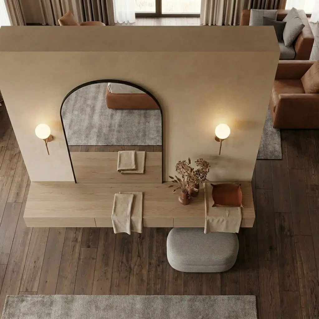 Additionally, the round wall mirror enhances the visual depth of the space. The reflective surface helps distribute natural light across the room, making the area appear brighter and more spacious. Meanwhile, the floating console provides concealed storage through integrated drawers that maintain a seamless front profile.