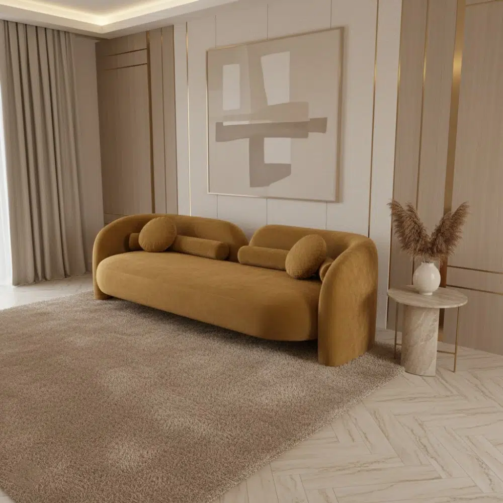 The Aura velvet Luxury Sofa is a high-end modern designer sofa crafted for luxury interiors across Dubai, Abu Dhabi, and Sharjah. Featuring a sculptural silhouette, rounded arms, and plush bouclé upholstery, this sofa delivers both visual impact and superior comfort, making it a statement piece for premium homes.