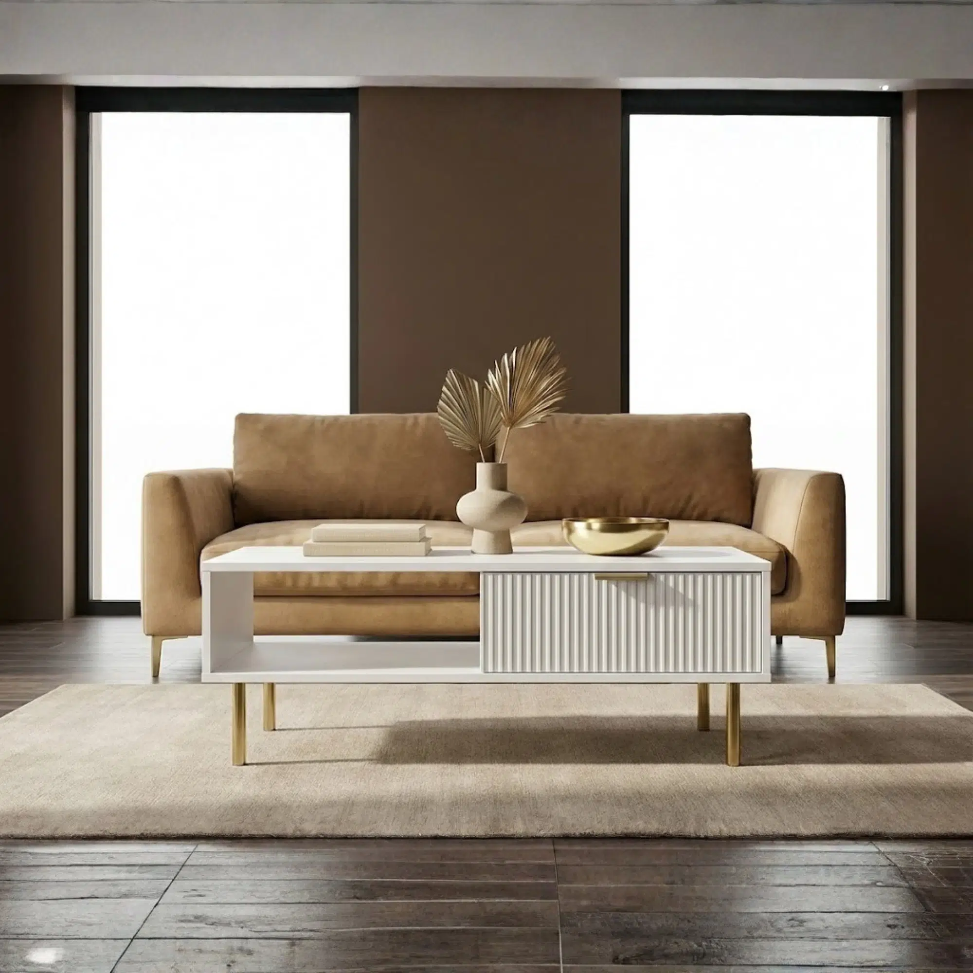 The Aurelia Centre Table adds refined beauty to modern living spaces. It is designed for homeowners who value elegance and smart use of space. Moreover, its white tabletop and fluted detailing create a clean and stylish look.