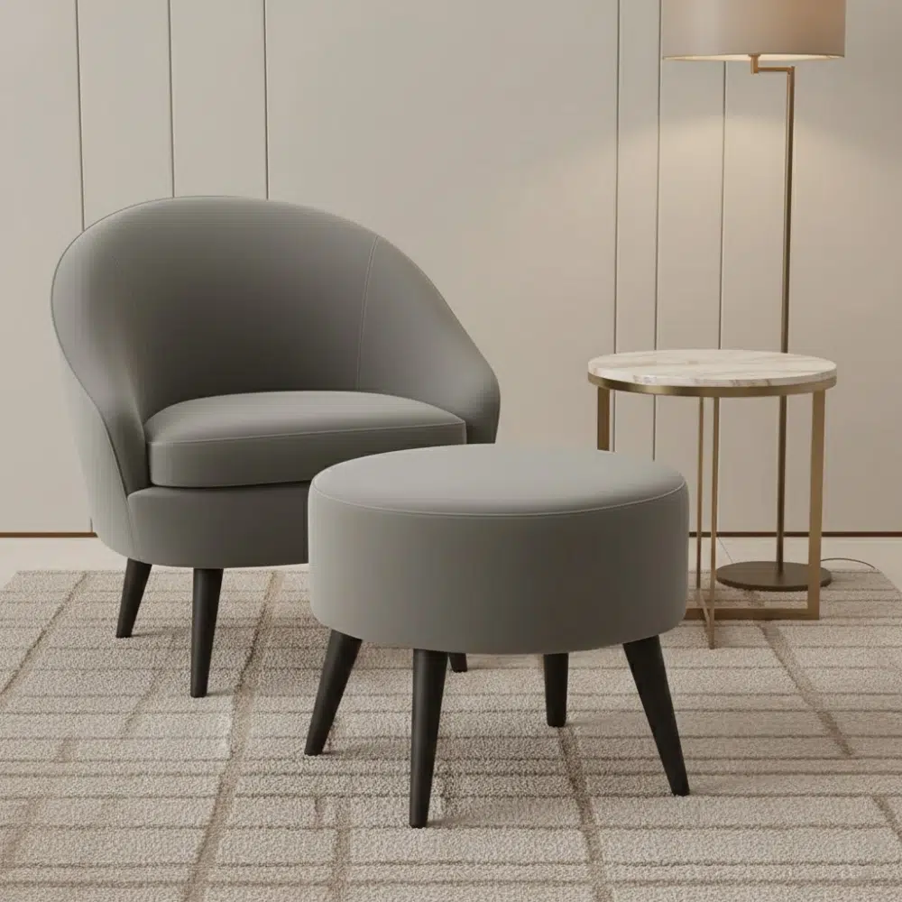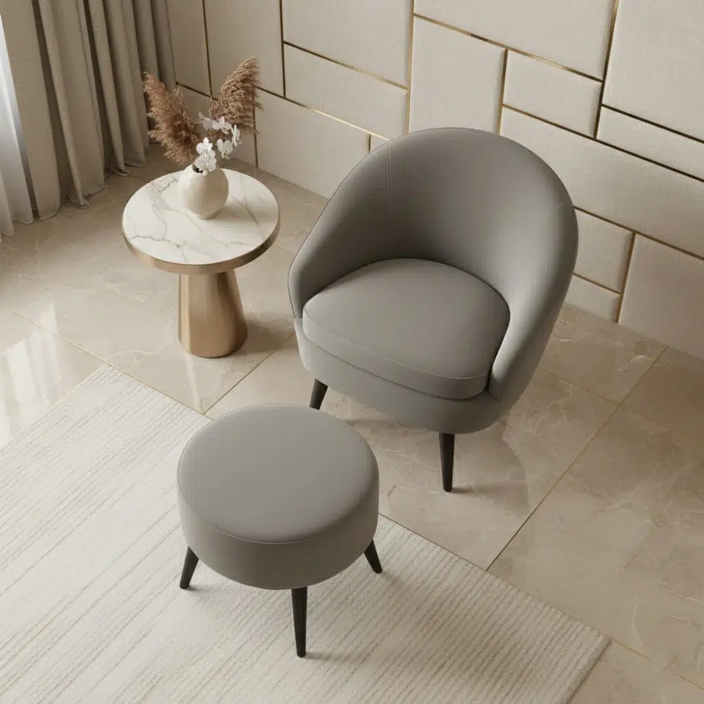 The Aurelio Armchair and Ottoman Set brings together modern design, luxurious comfort, and timeless elegance—making it a perfect addition to any contemporary living space. Featuring a smooth, rounded backrest that hugs the body, the armchair provides wraparound comfort ideal for relaxing, reading, or unwinding after a long day. The matching ottoman adds versatility, serving as both a footrest and an additional seating option, enhancing overall comfort and functionality.