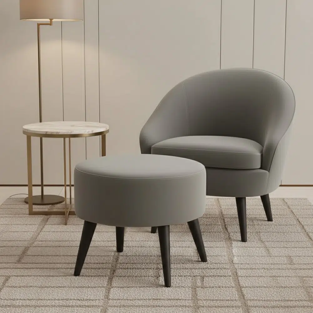 The Aurelio Armchair and Ottoman Set features soft velvet upholstery, foam comfort, a rounded modern design, and tapered legs. A perfect combination of style and relaxation for living rooms, bedrooms, and lounge spaces.