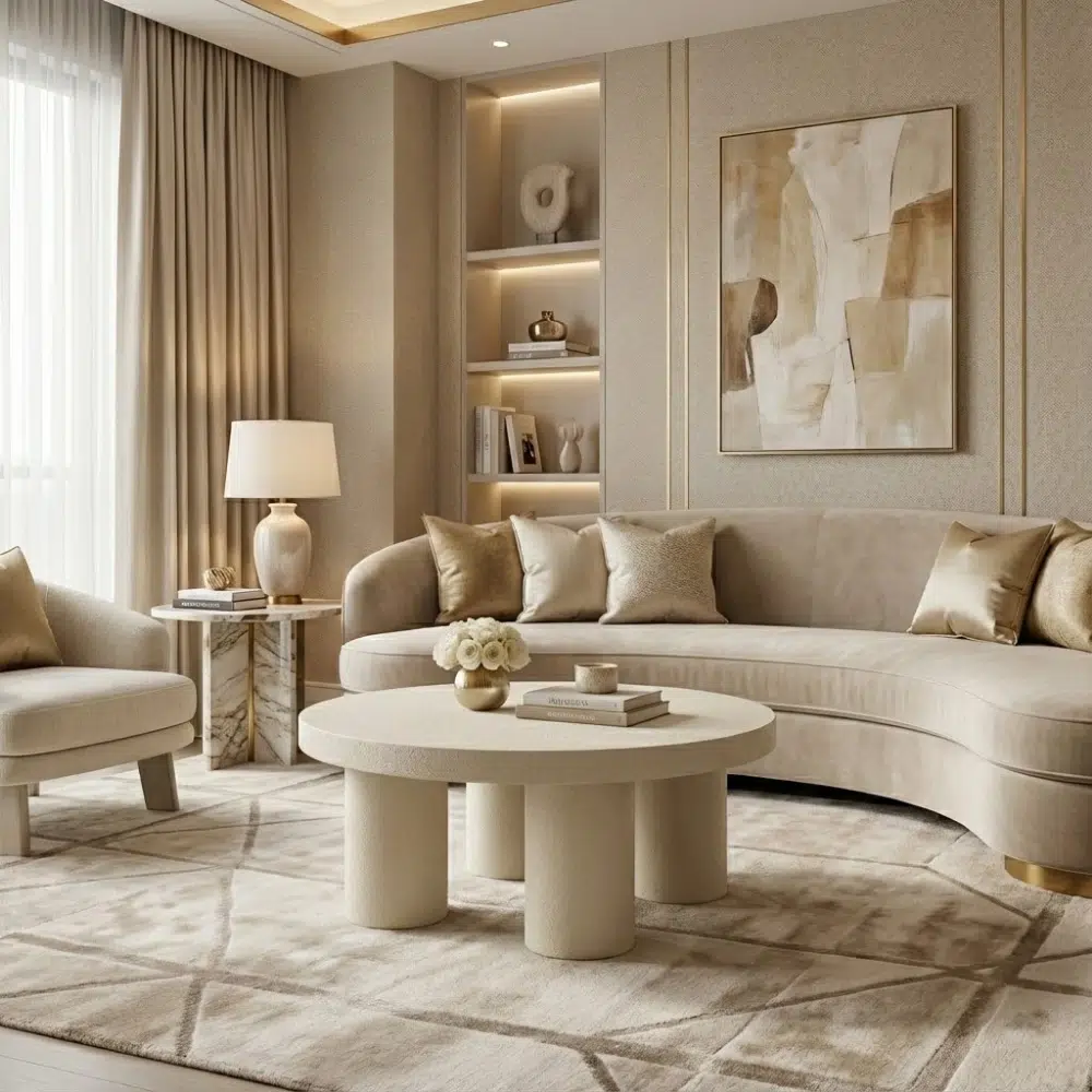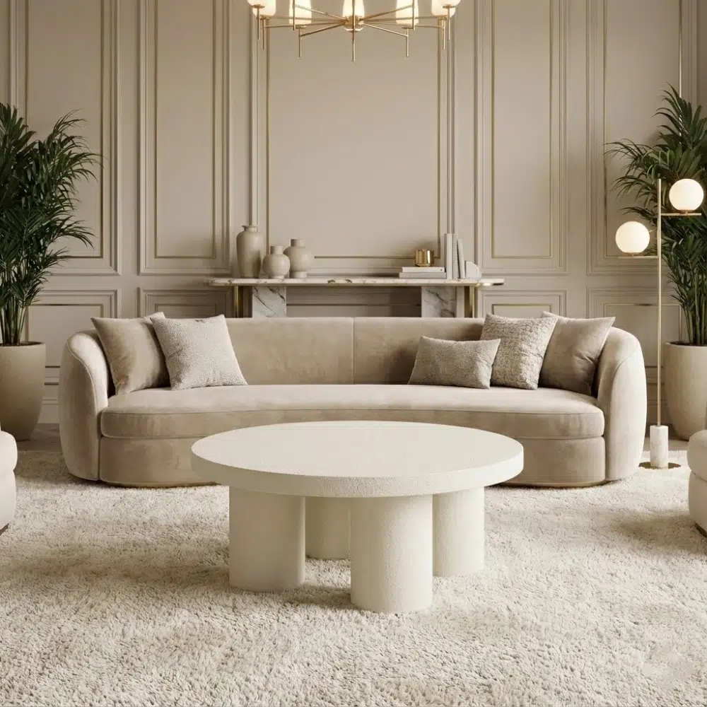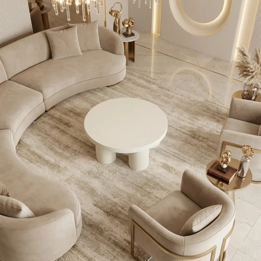 A round modern coffee table featuring sculptural pedestal legs and a premium plaster-textured finish  elegant, durable, and made for luxury UAE interiors.