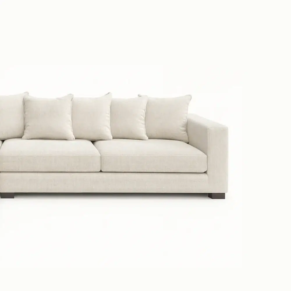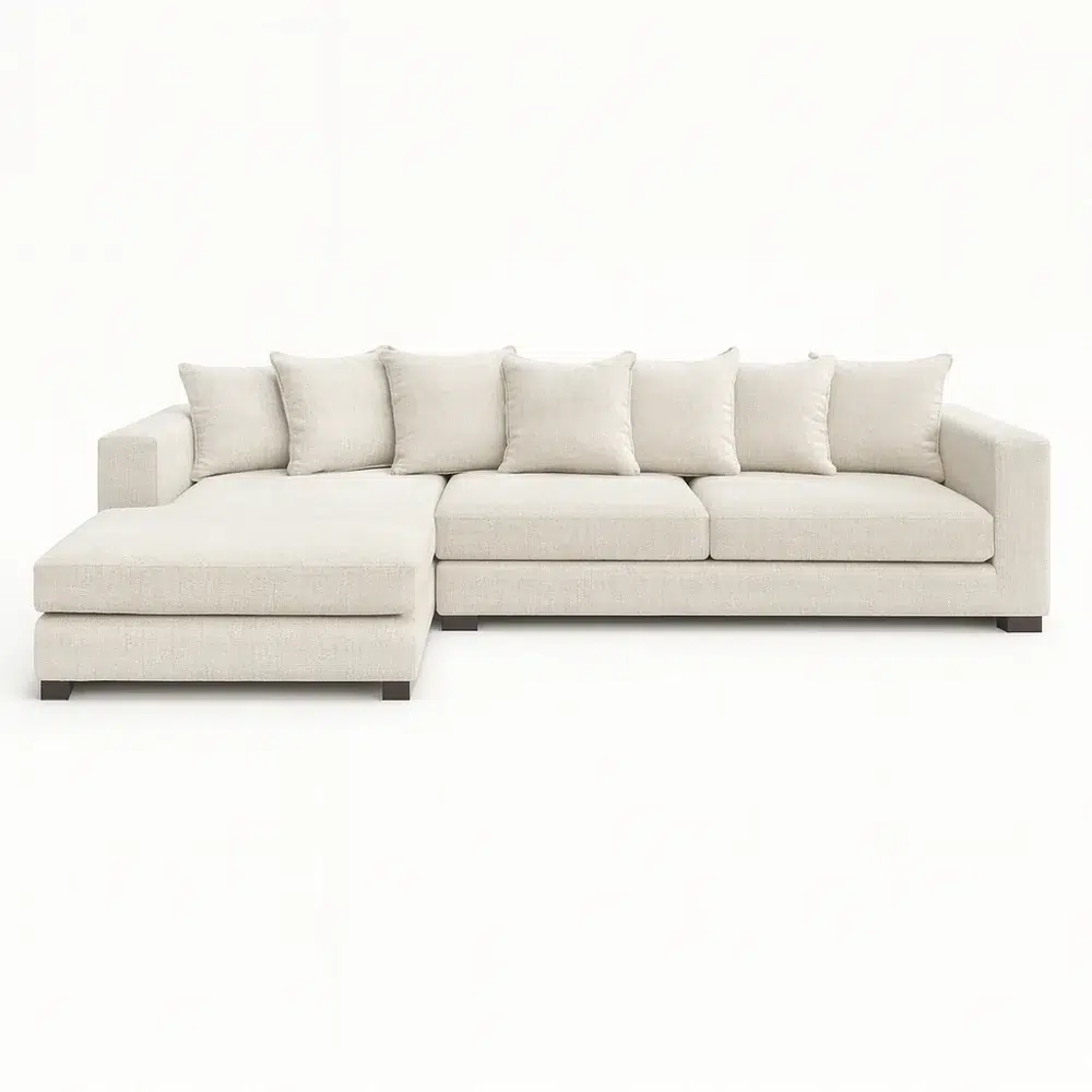 The Caspian Luxe Sectional Sofa offers premium comfort with its deep seating, soft cream upholstery, and spacious L-shaped design. A perfect fit for Dubai, Abu Dhabi, and Sharjah homes seeking a modern, elegant centerpiece.