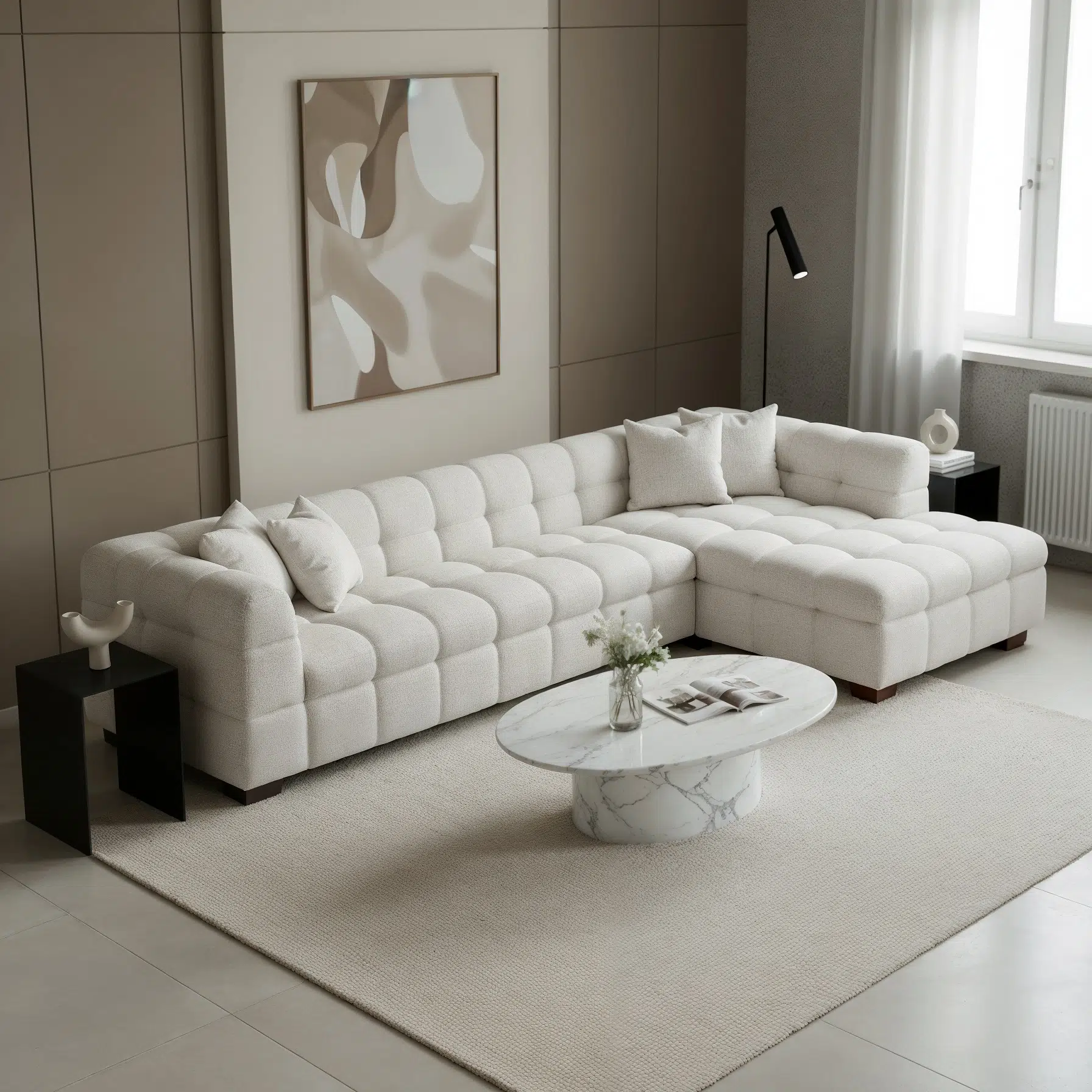 In addition, the soft boucle fabric introduces a warm and textured feel that instantly makes the space more inviting. At the same time, its refined appearance helps maintain a clean and contemporary interior style. Furthermore, the deep channel stitching adds visual depth, giving the sofa a distinctive and luxurious look.