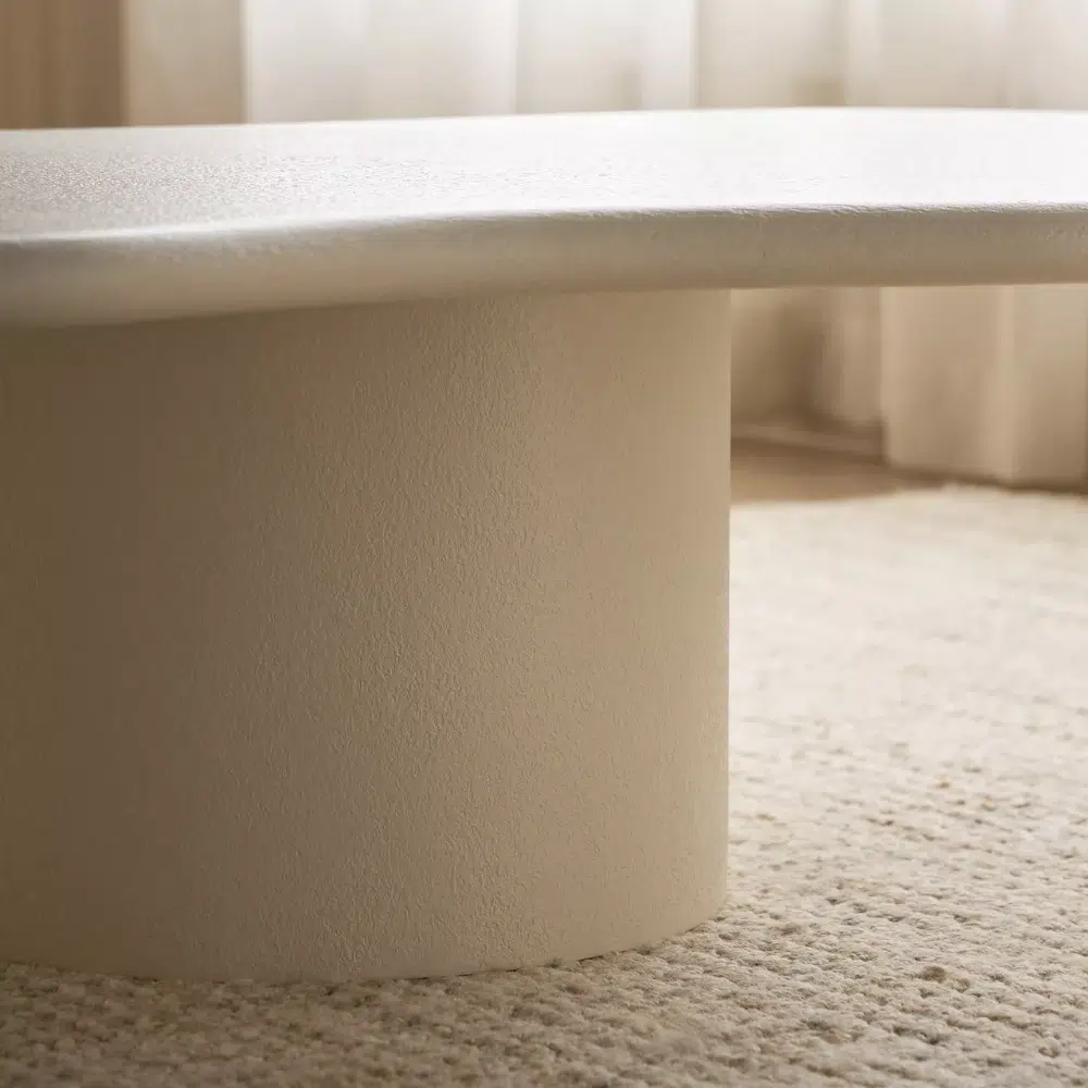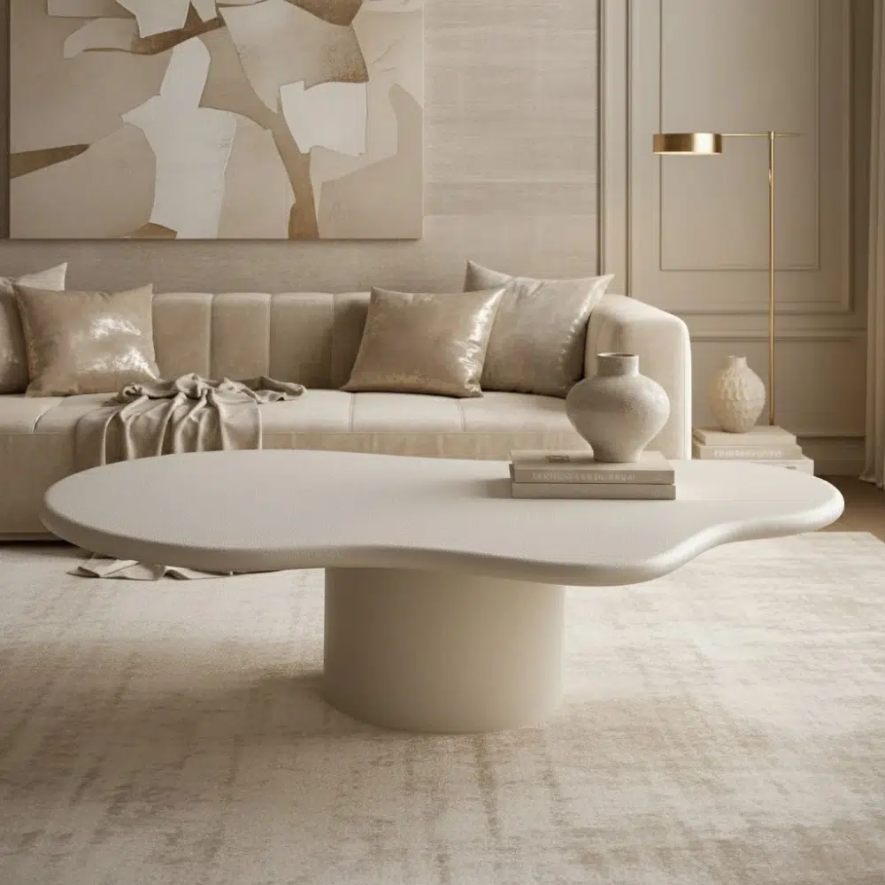 A sculptural organic-shaped coffee table crafted with a smooth plaster-textured finish and a cylindrical pedestal base. The Cloudy Luxury Coffee Table brings modern softness, elegance, and artistic form to contemporary UAE living rooms.