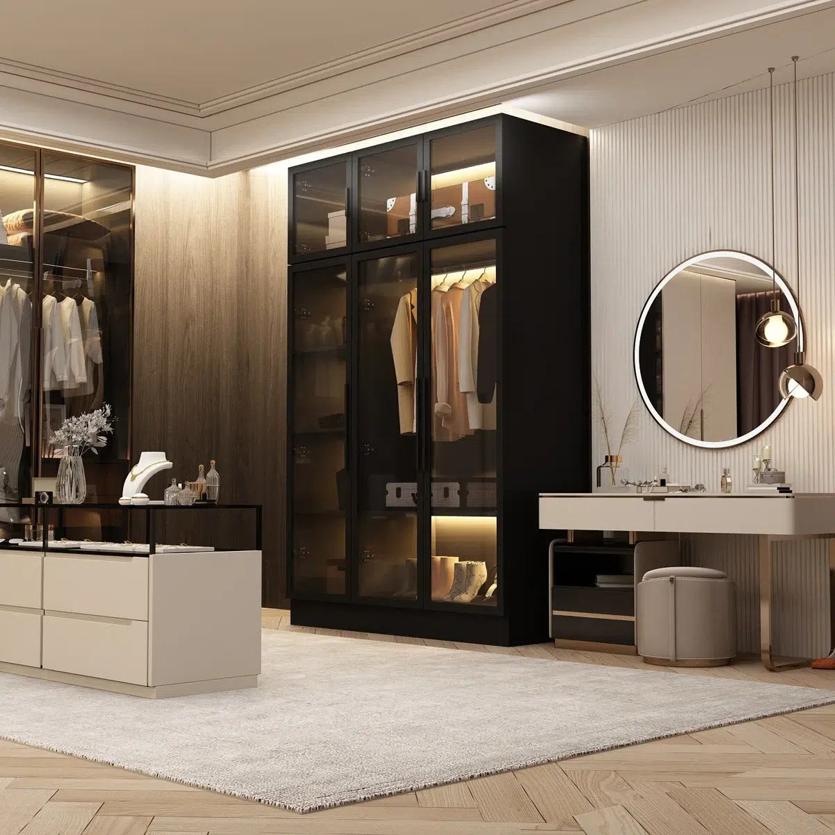Luxury glass wardrobe with interior lighting and smart storage by karnak home uae perfect for modern Dubai bedrooms