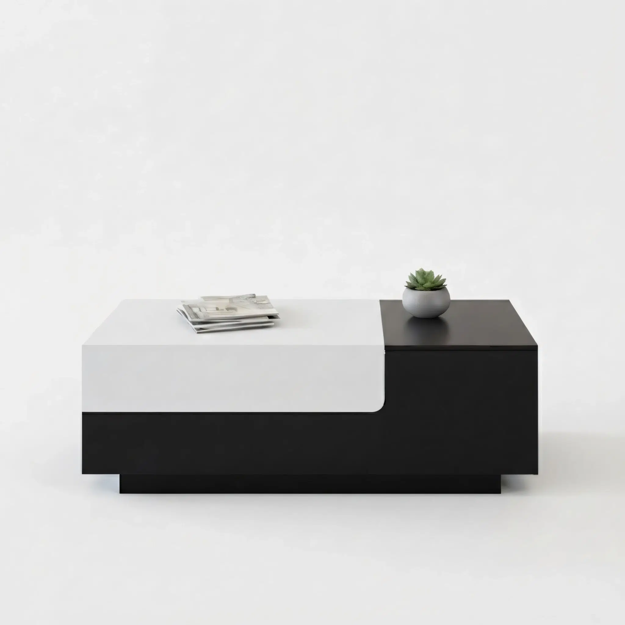 The Duvex centre table with storage adds a refined and modern touch to contemporary living spaces. With its bold two-tone black and white finish, this modern centre table creates a strong visual contrast. Moreover, the clean lines enhance its elegant appeal. As a result, it suits stylish interiors perfectly.