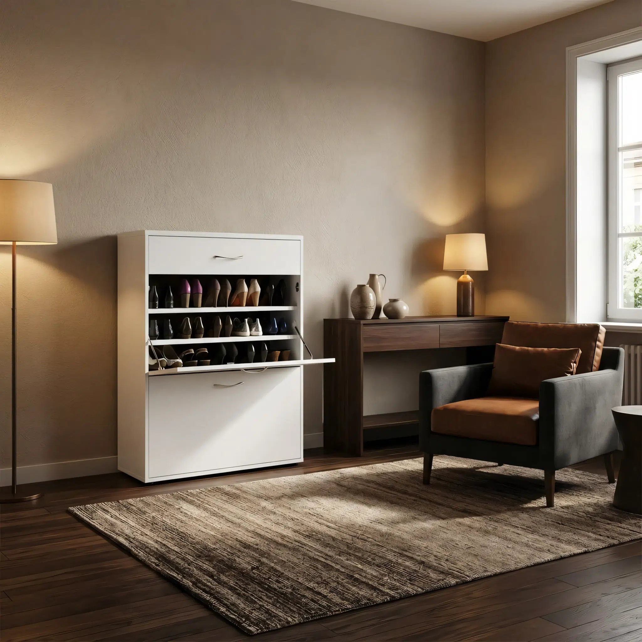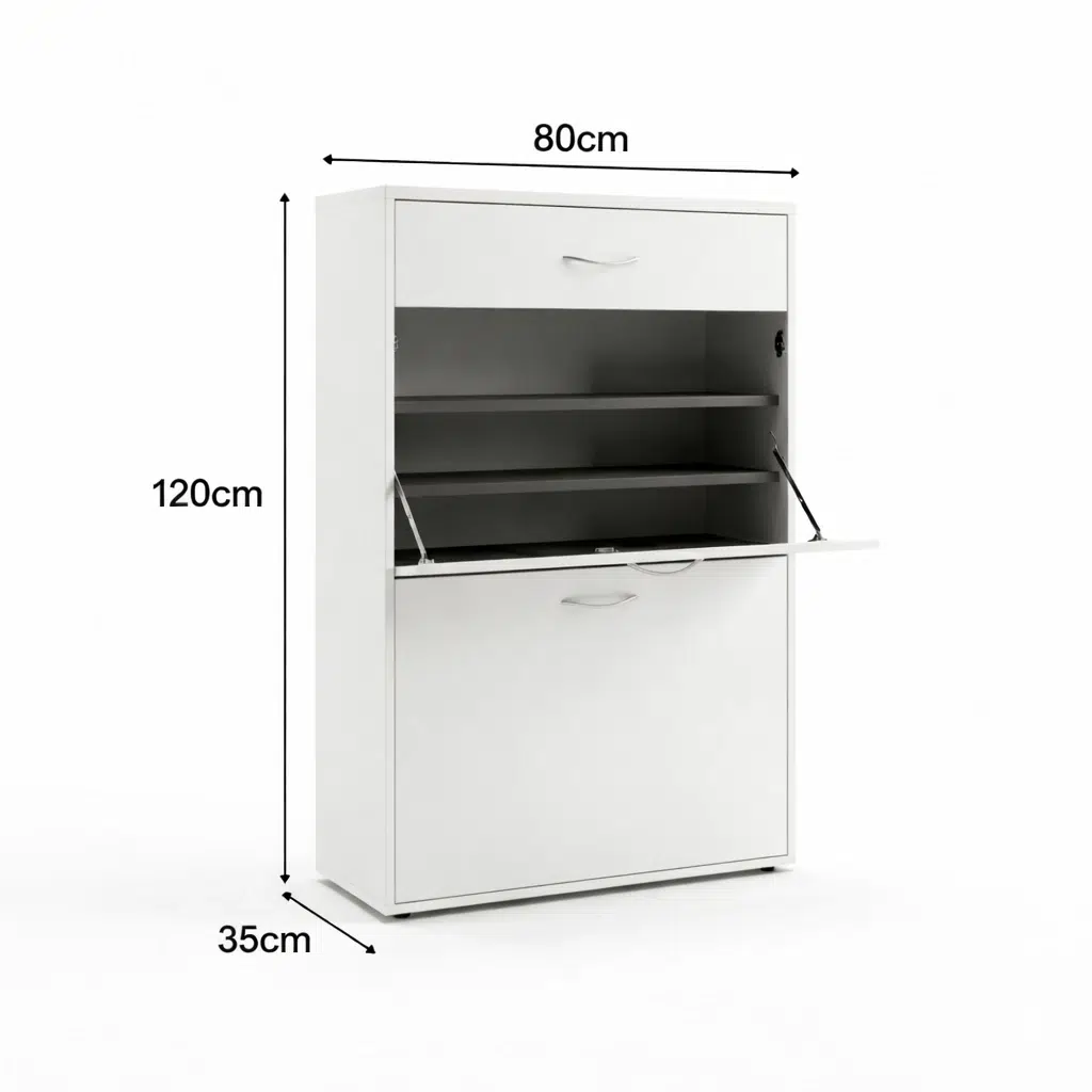Additionally, this shoe cabinet keeps footwear neatly concealed. Therefore, hallways and bedrooms stay organized and clutter free. Its minimalist white finish adds brightness. Consequently, it blends easily with modern interiors where style and function matter.