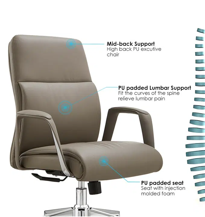 Meanwhile, the armrests can move forward, backward, sideways, and up and down. Therefore, users can adjust arm support based on desk tasks. The 60 mm castors allow smooth movement across floors. Overall, this executive PU office chair combines reclining control, foam comfort, and adjustable arm support for UAE work environments.