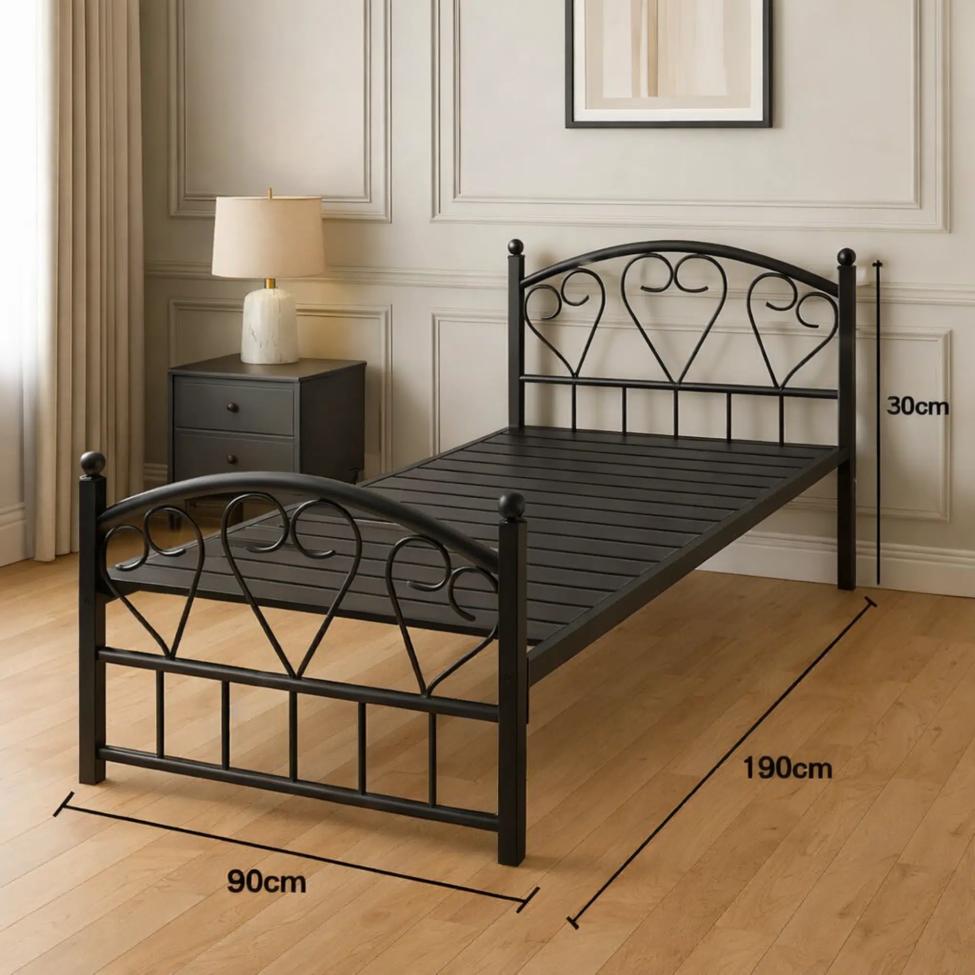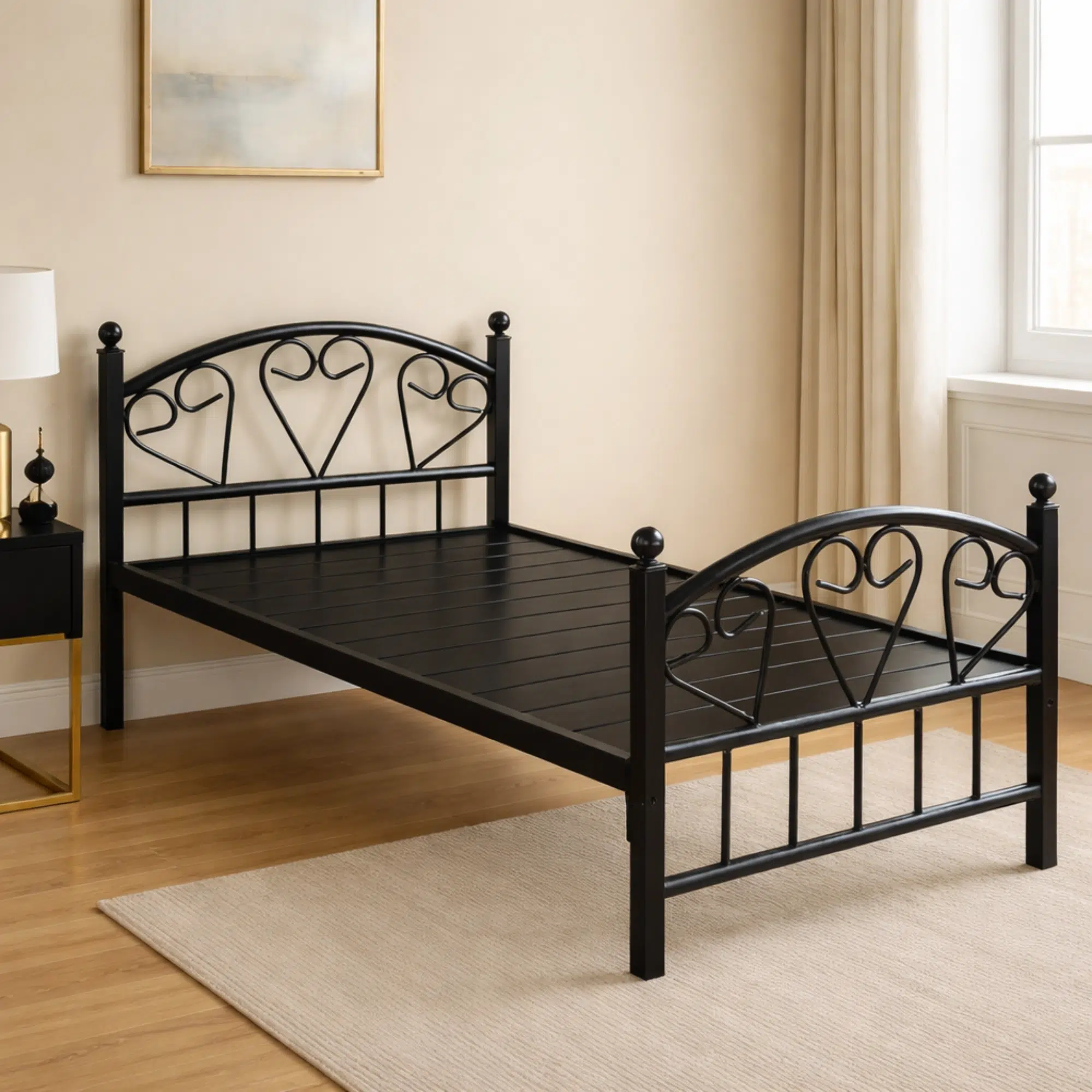 Additionally, the black finish gives the bed a neat and versatile appearance that works well in many interiors. The steel frame provides dependable support for daily use, making it a practical solution for both project and residential settings. Meanwhile, its straightforward design allows it to fit easily into spaces that require efficient furniture planning without compromising stability.