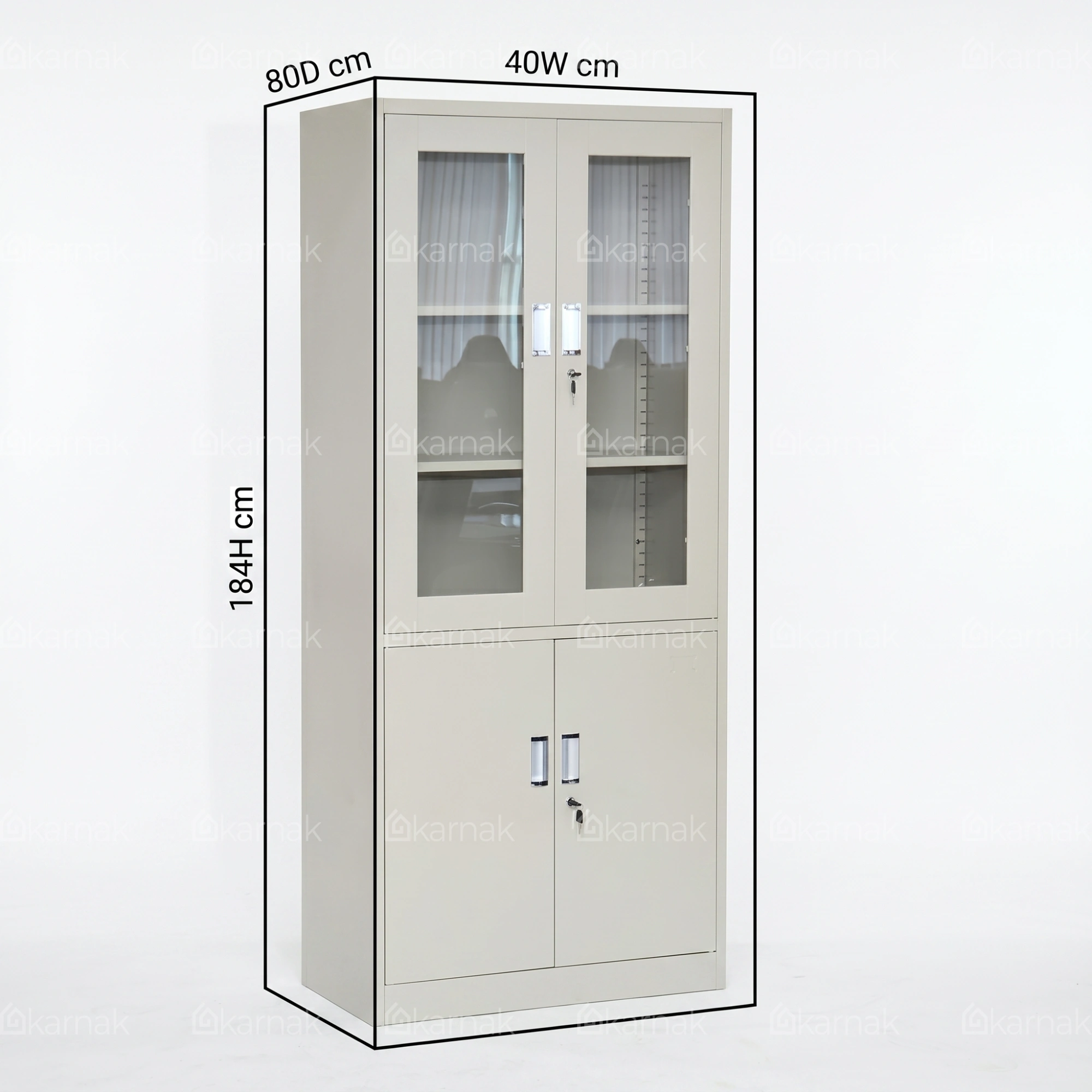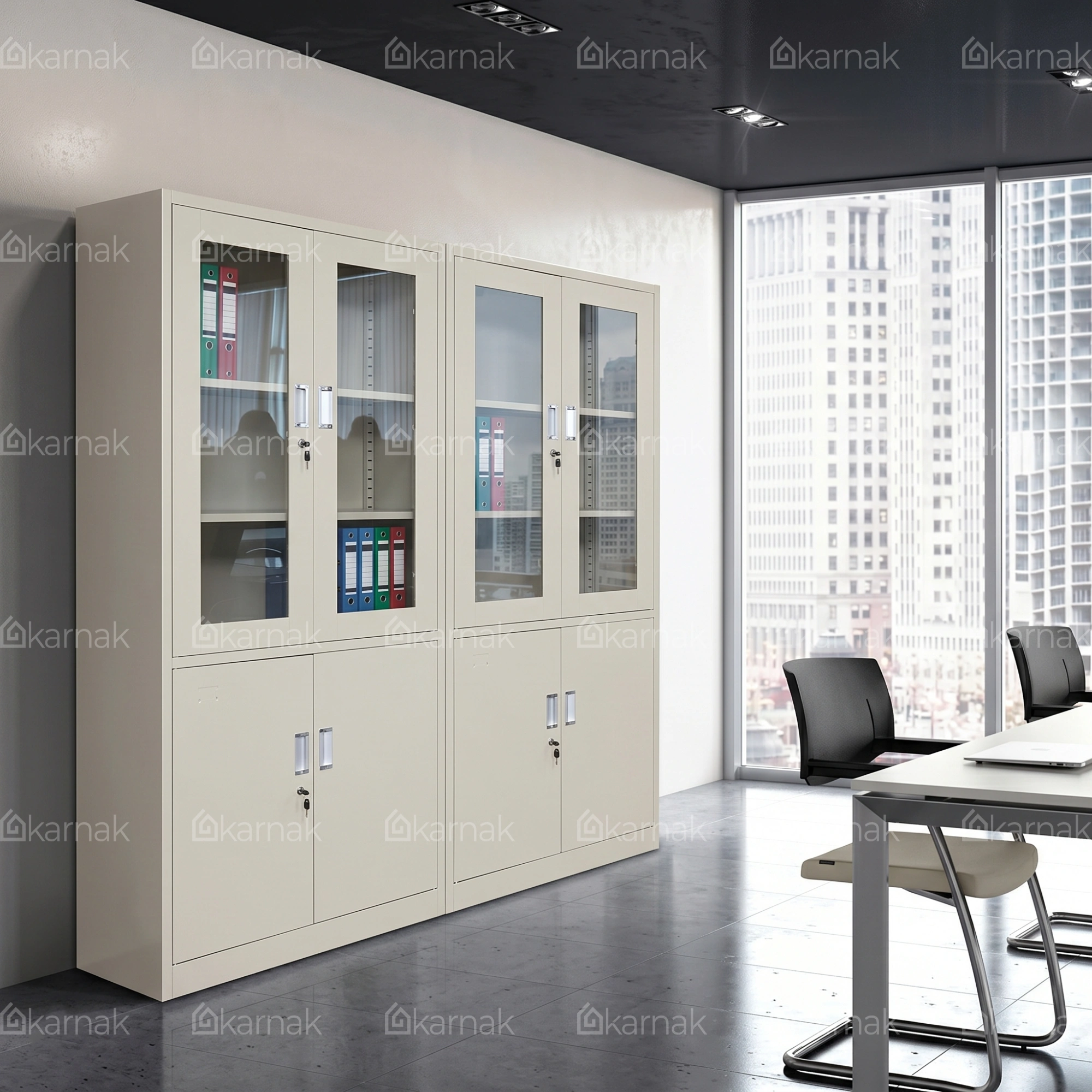 Additionally, the cabinet features upper glass doors that allow clear visibility of stored items, making access more efficient. The lower enclosed section helps keep documents protected and neatly hidden. Meanwhile, the built-in key lock system provides added security for important files and office supplies. The tall structure supports efficient use of vertical space.