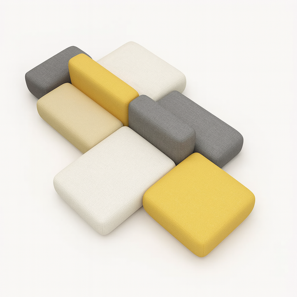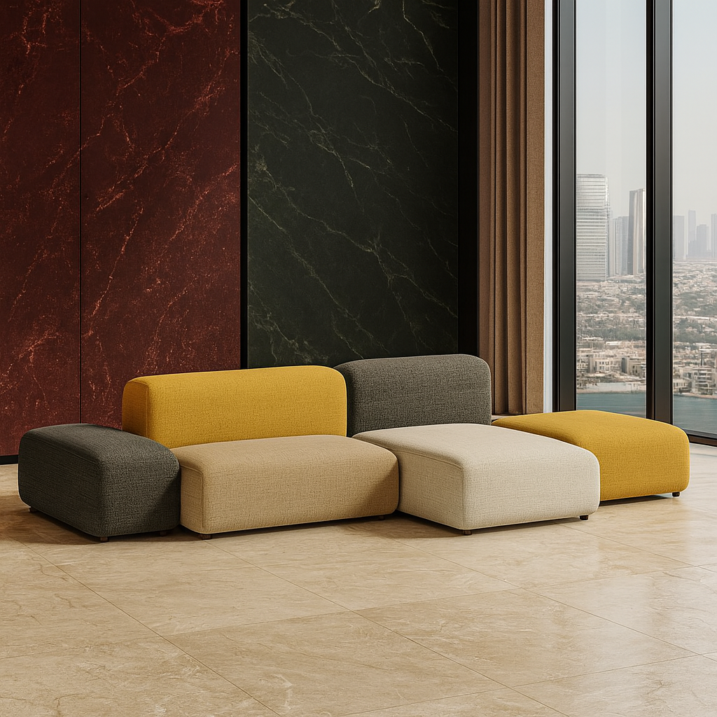 A modern and flexible sofa with a sturdy wooden frame, high-density cushions, and premium fabric or leather upholstery. Its modular design allows endless layout possibilities for homes, lounges, and offices
