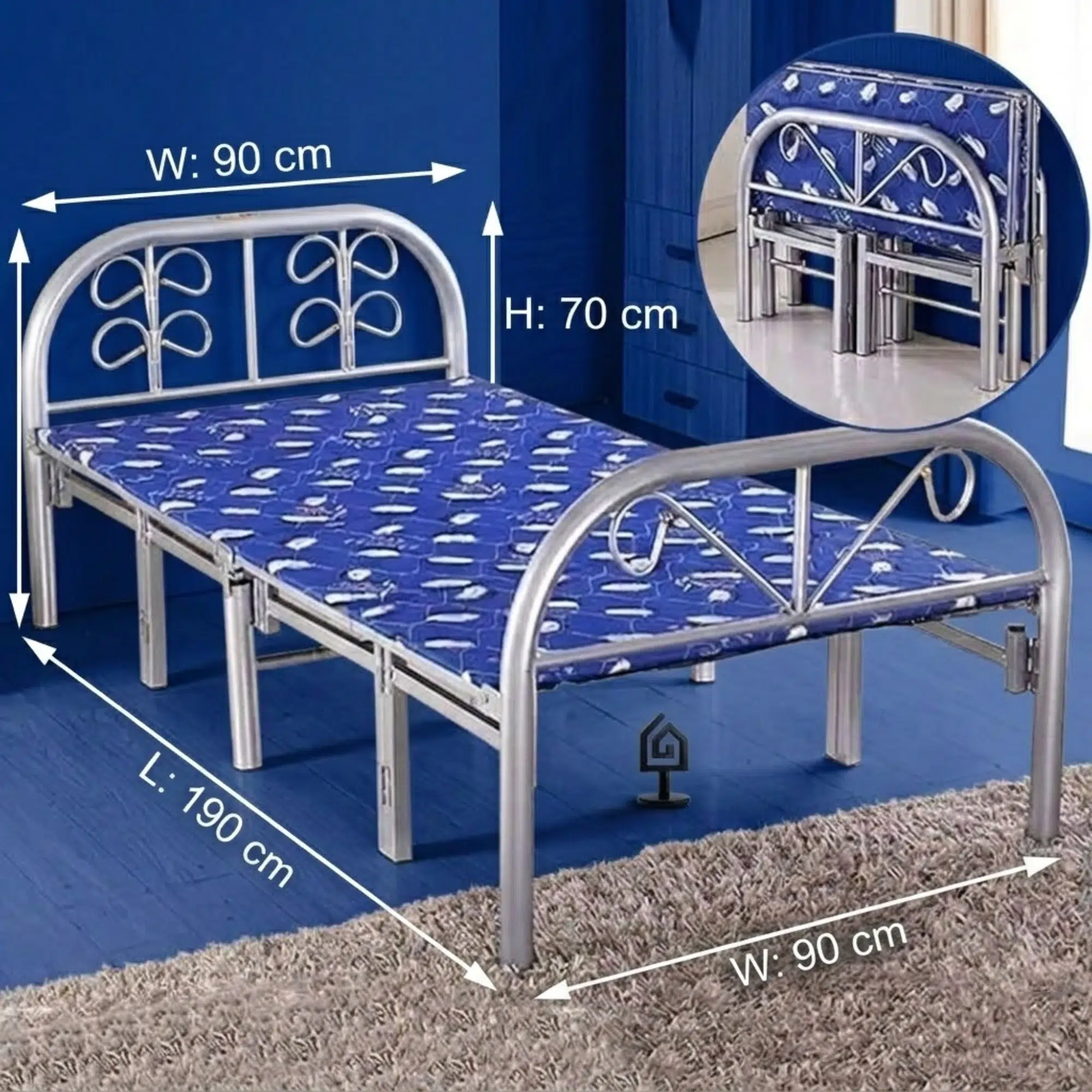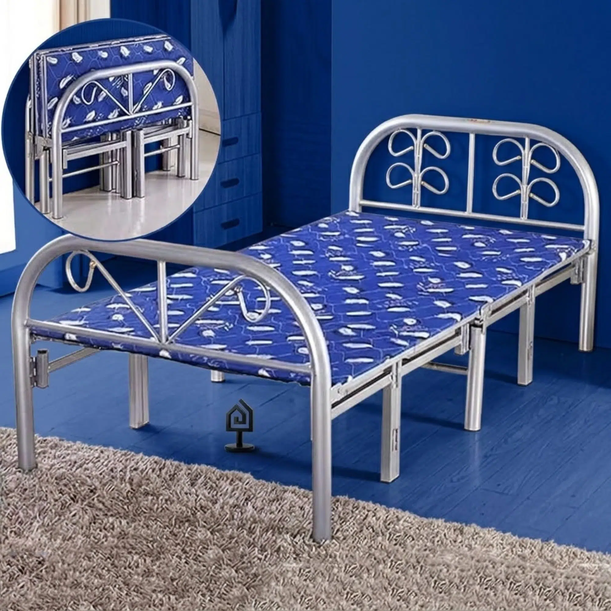 Furthermore, this practical piece serves as a space-saving solution for homeowners looking to maximize floor area. Specifically, the arched headboard and footboard feature decorative metal scrolls that add a traditional touch to the functional design. Additionally, the blue patterned mattress surface provides a ready-to-use sleeping solution straight out of the box.