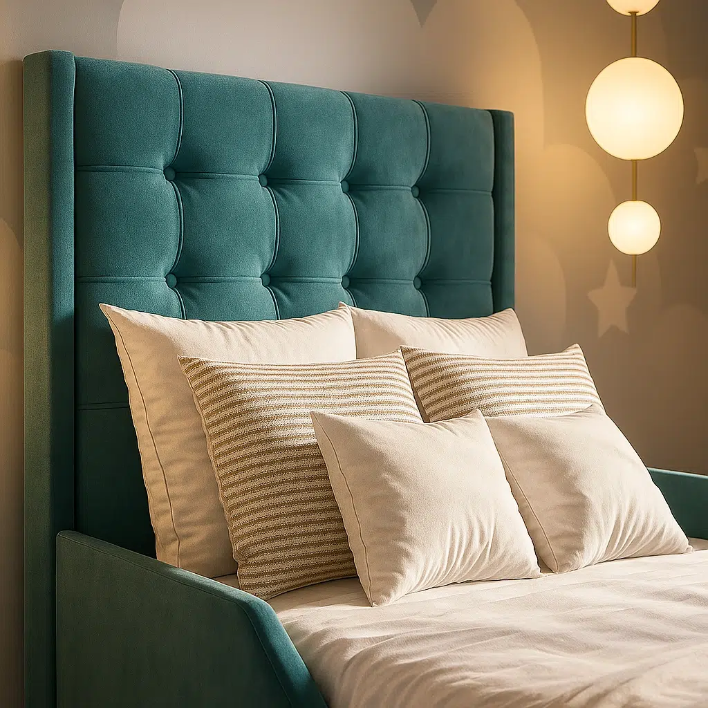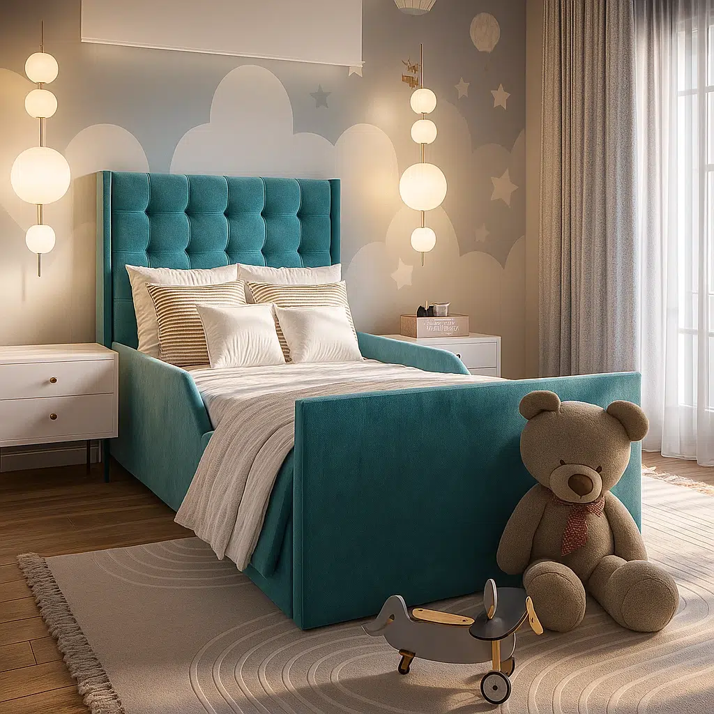 The Luxe Tuft  Bed is upholstered in rich teal velvet, giving it a refined yet playful look.