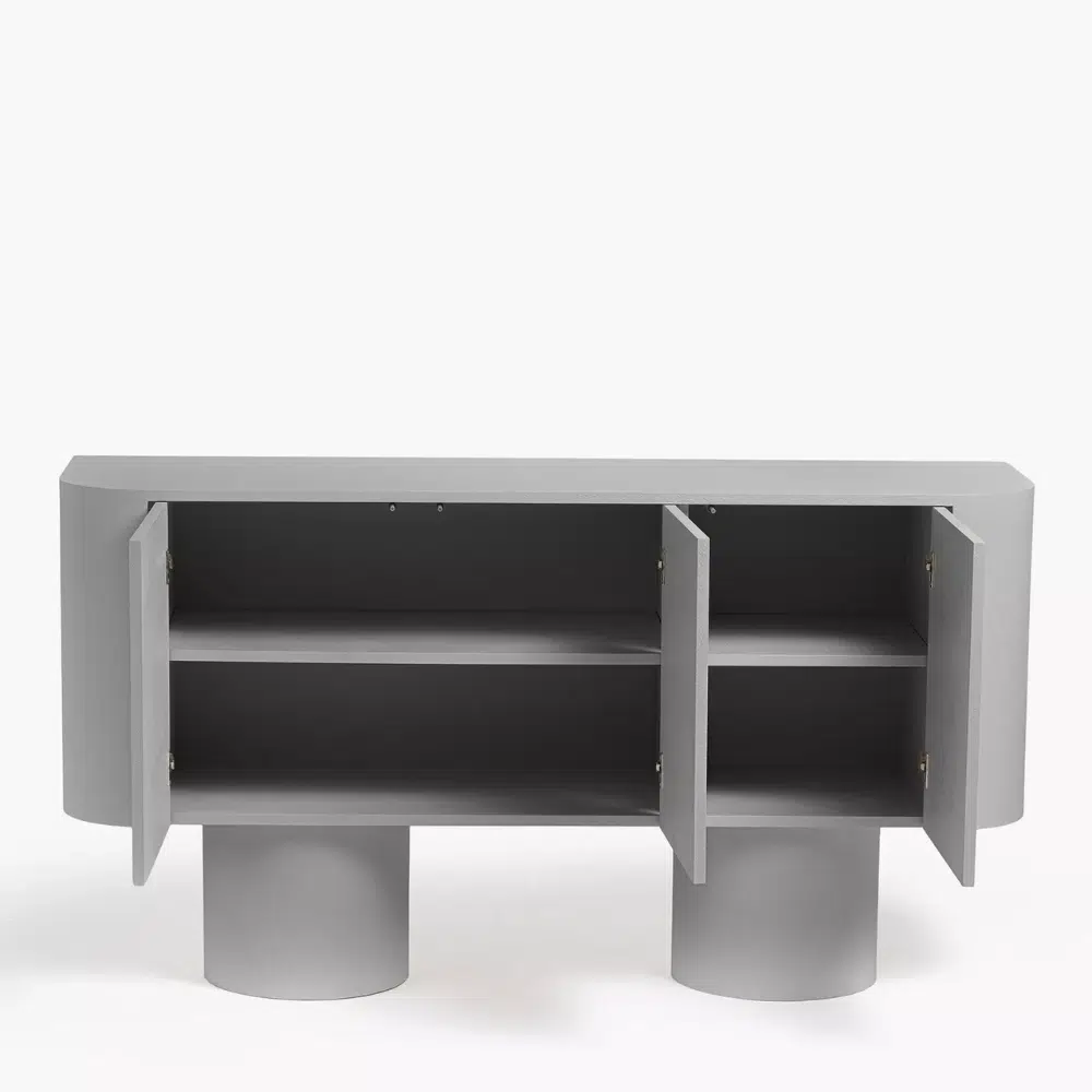 The Monaco Buffet is a modern sculptural storage piece designed to elevate luxury UAE interiors with its bold silhouette and refined minimalist detailing. Featuring a sleek rectangular body with rounded edges, supported by striking cylindrical pedestal legs, this buffet blends contemporary artistry with everyday functionality. Its smooth plaster-textured finish adds a premium tactile feel, making it a statement addition to dining rooms, living areas, and sophisticated hallways.