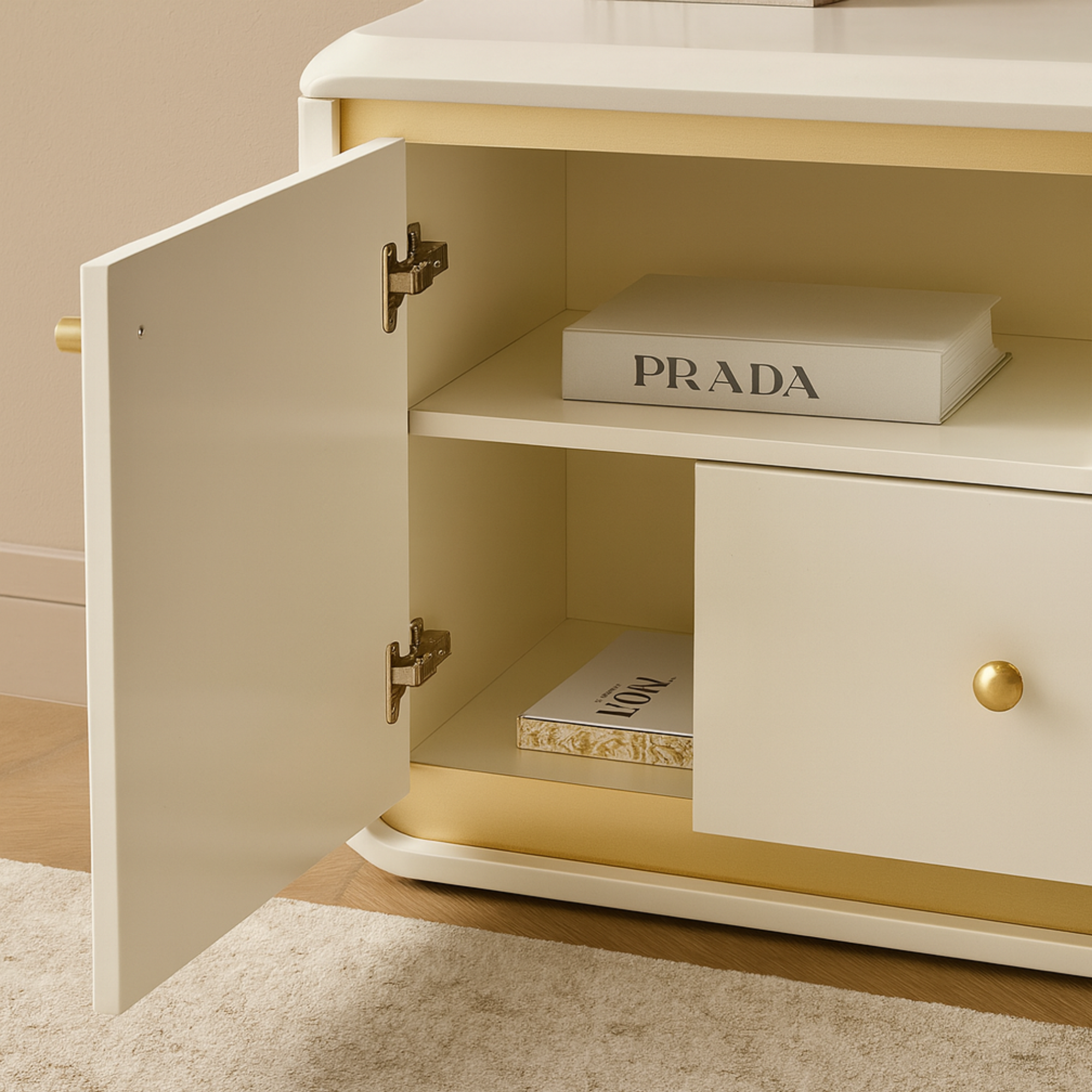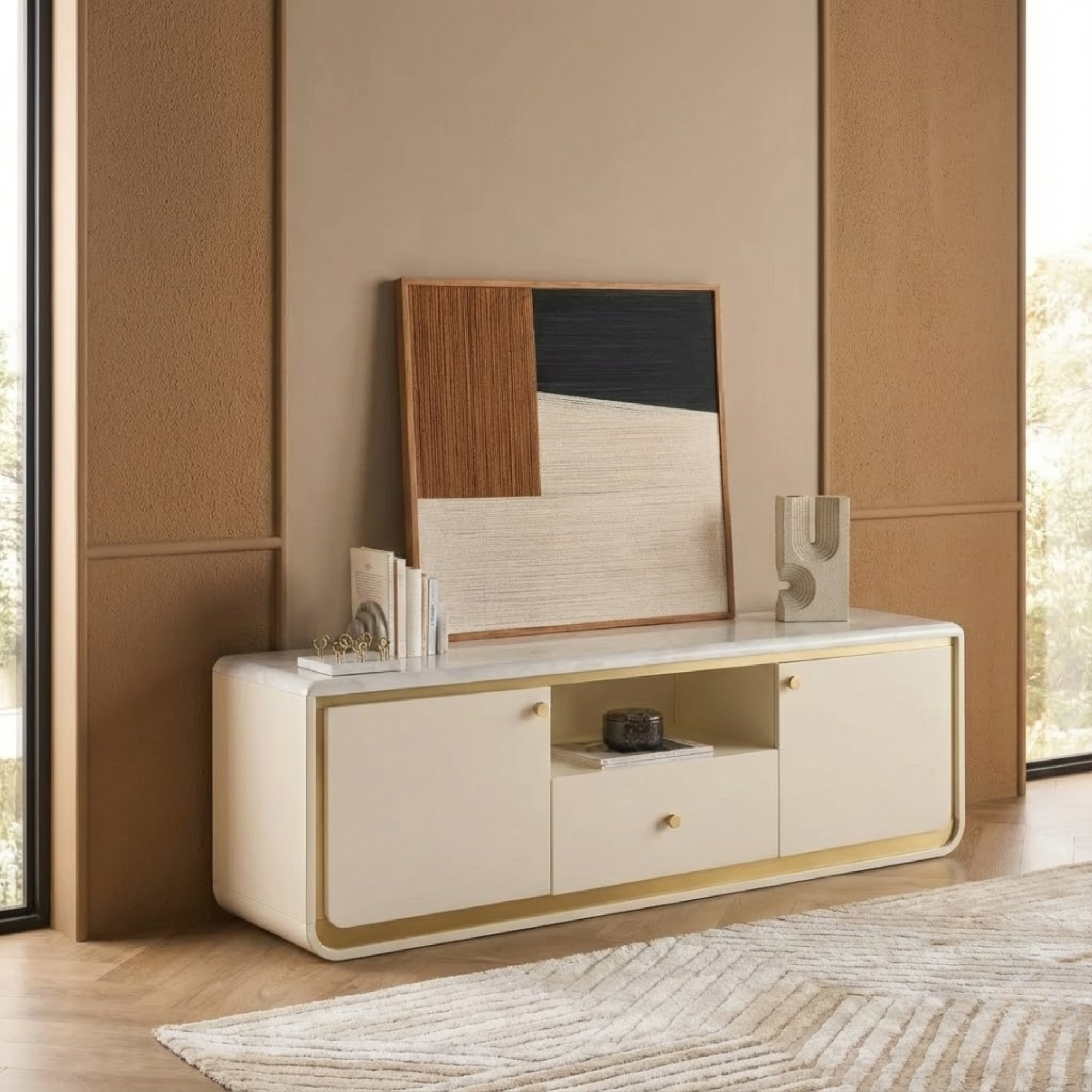 Built to support TVs up to 55 inches, this modern media unit features a sleek combination of closed storage and open shelving, making it ideal for organizing media devices, accessories, and décor. The soft curved edges, paired with metallic accents, give it a Modern Luxe TV console look that perfectly suits contemporary apartments and villas across the UAE.