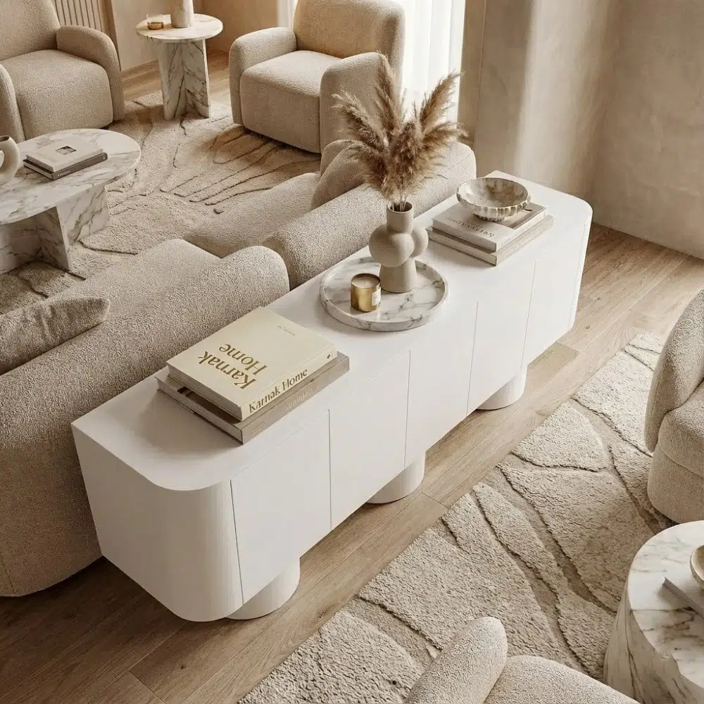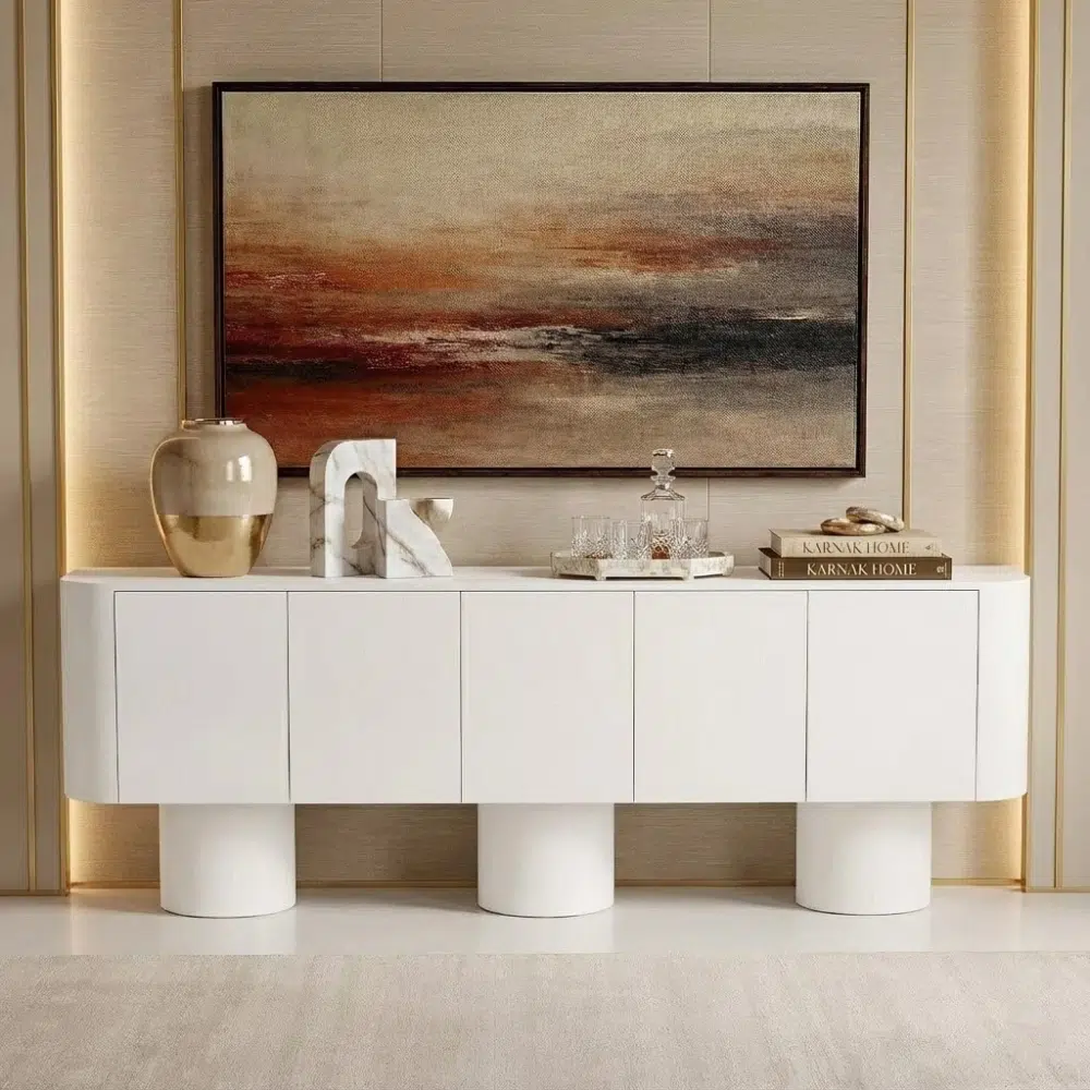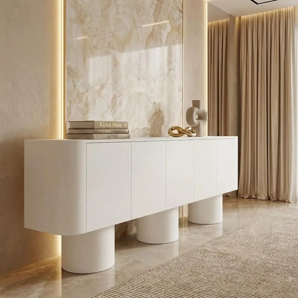 The Luxury Opulent Crest Buffet is a true statement of modern sophistication, crafted for expansive UAE interiors that demand presence, elegance, and architectural beauty. With its elongated 245 cm length, this buffet becomes the centerpiece of any dining room, hallway, or living space. The softly curved edges and sculptural cylindrical legs create a refined silhouette, while the smooth plaster-textured finish adds a calming, high-end aesthetic.