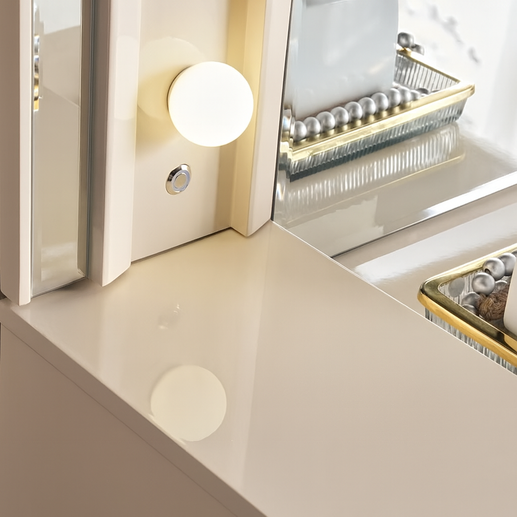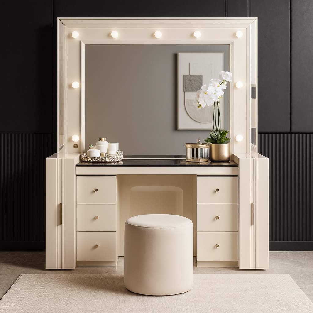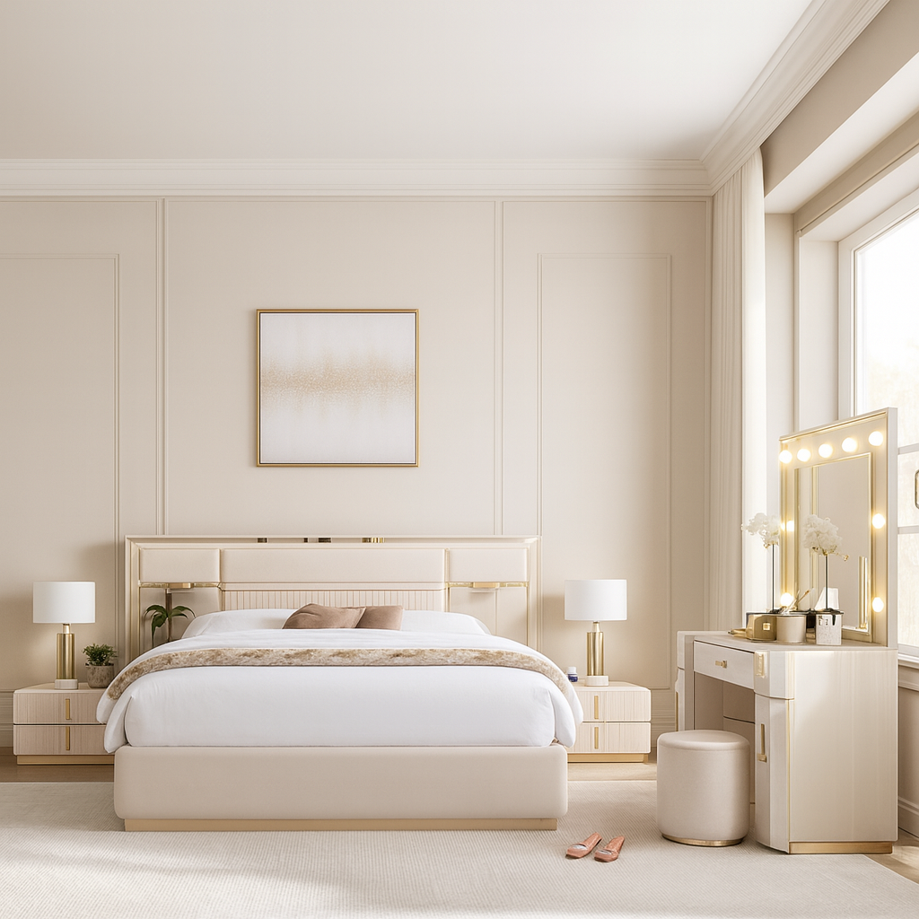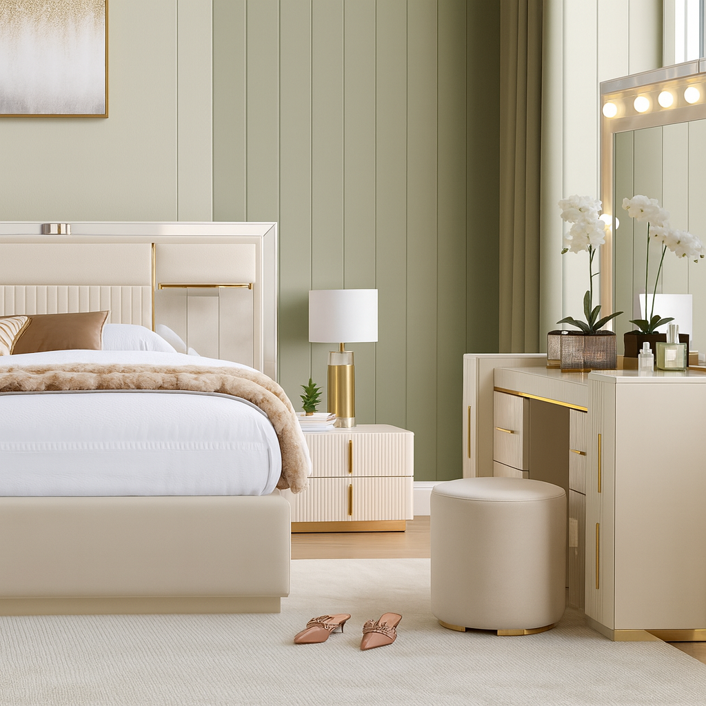 The centerpiece a sumptuous upholstered bed features a tall, padded headboard with vertical panel detailing and integrated lighting, creating a serene and contemporary atmosphere. Two coordinated nightstands offer convenient storage, while the dressing table with illuminated mirror and matching stool bring Hollywood-inspired glamour to your daily routine.