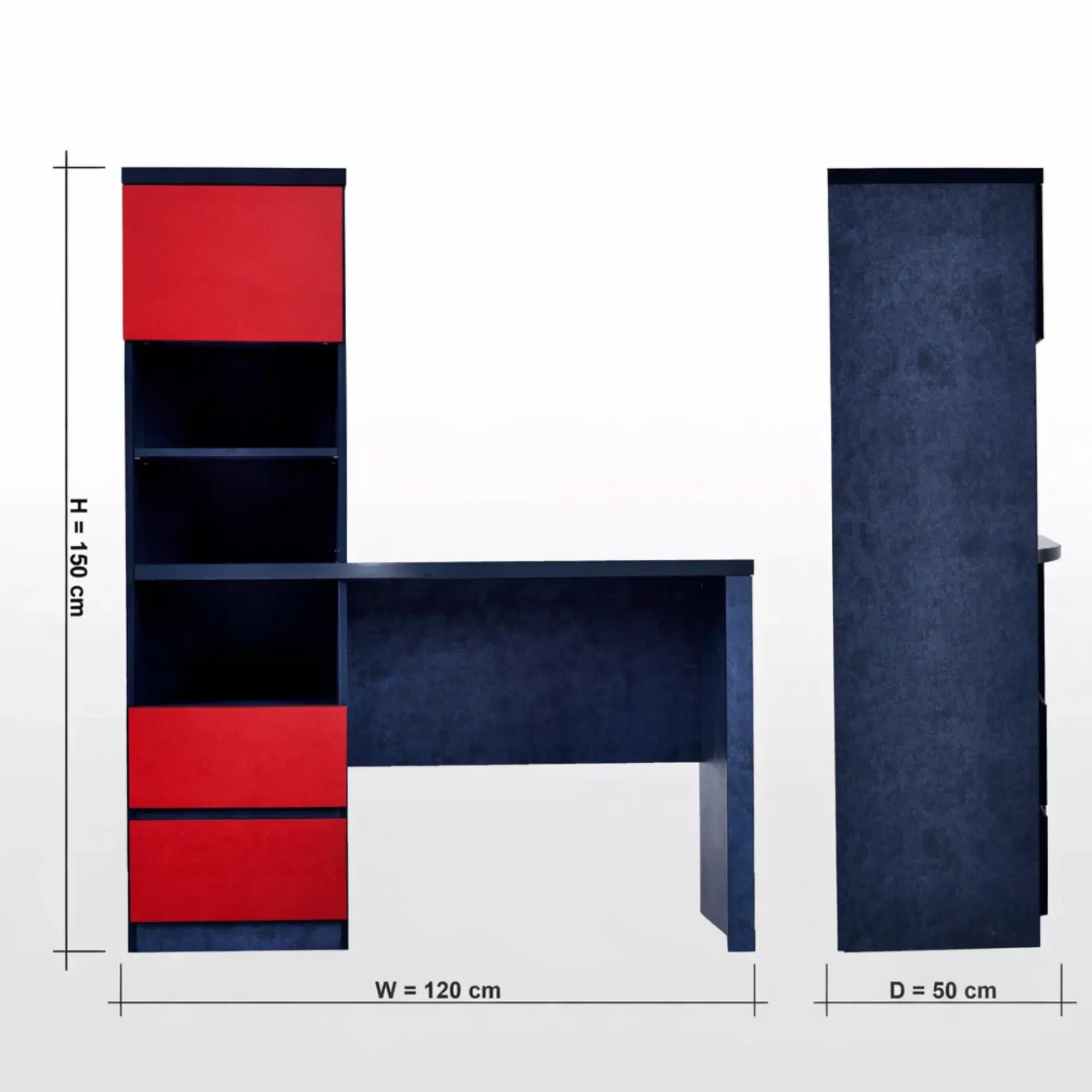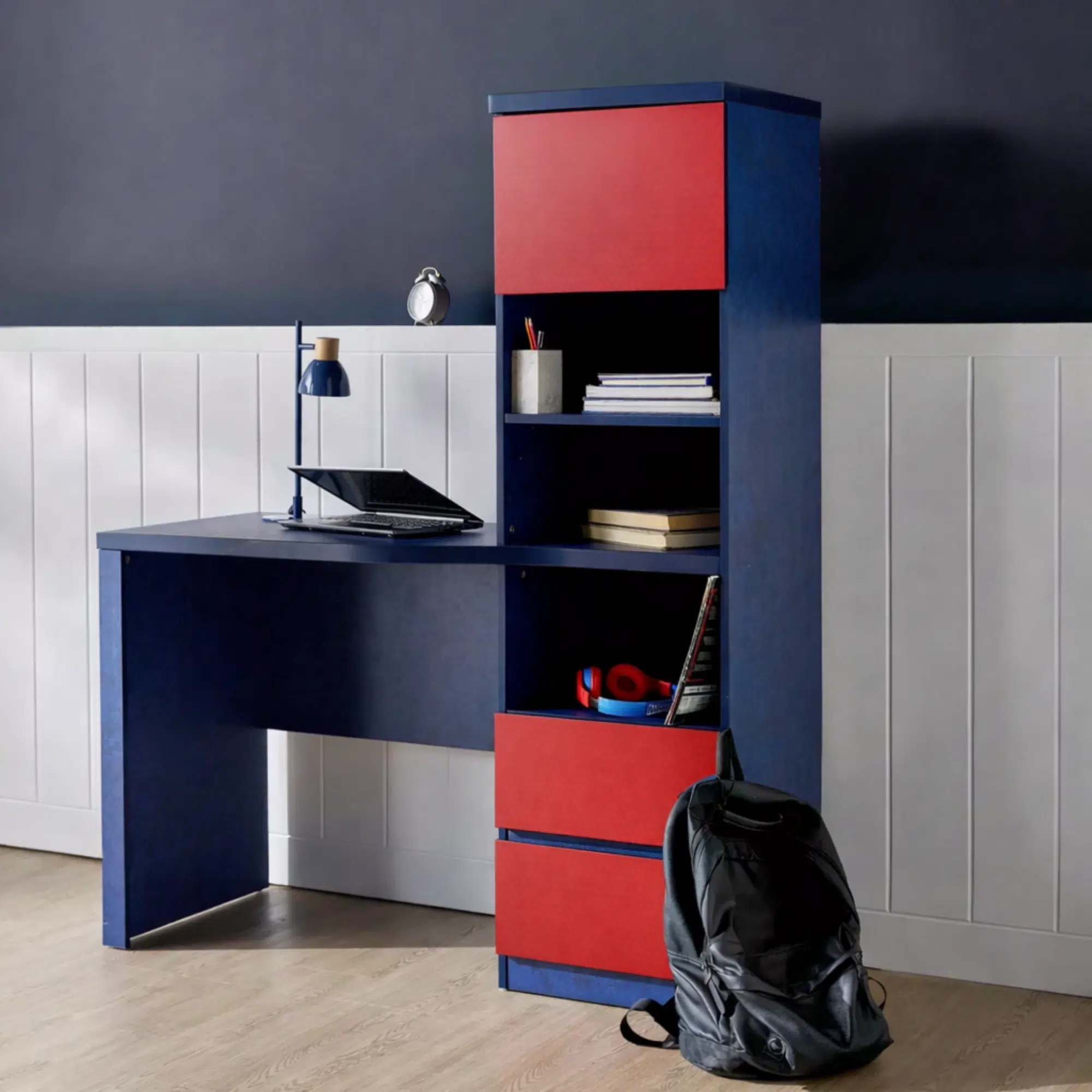 Overall, the Merovixor Toddler Study Desk provides a colorful and practical workspace designed for children’s learning areas. Its structured layout combines a comfortable desk surface with vertical storage, helping keep study materials organized. The fully painted finish in blue and red adds a playful look that fits well in modern kids’ bedrooms and study spaces.