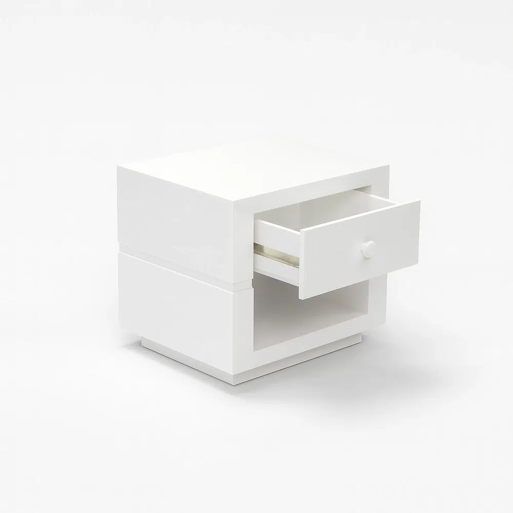 A modern minimalist bedside table with drawer and open shelf ideal for contemporary UAE bedrooms.