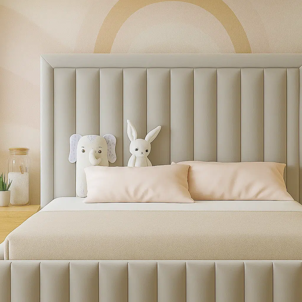 The bed features a clean, modern silhouette and a sturdy frame that supports daily use. In addition, its spacious headboard adds comfort during story time, reading, or relaxing. Furthermore, every edge is rounded and child-friendly, ensuring a safe and peaceful sleeping environment.
