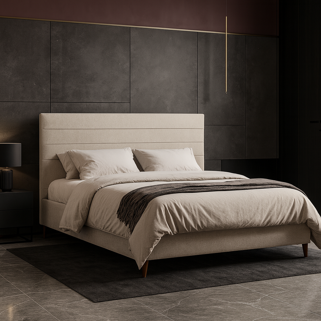 The Moca Bed is a refined modern contemporary upholstered bed crafted for elegant bedrooms across Dubai, Abu Dhabi, and Sharjah. Designed with a clean horizontal-panel headboard and soft upholstered finish, this bed delivers a calm, minimal luxury aesthetic that perfectly suits modern UAE interiors.