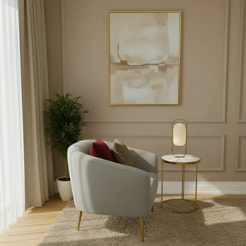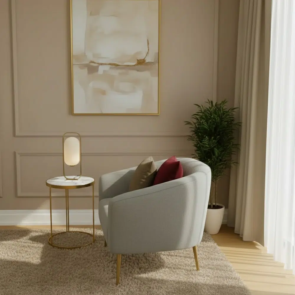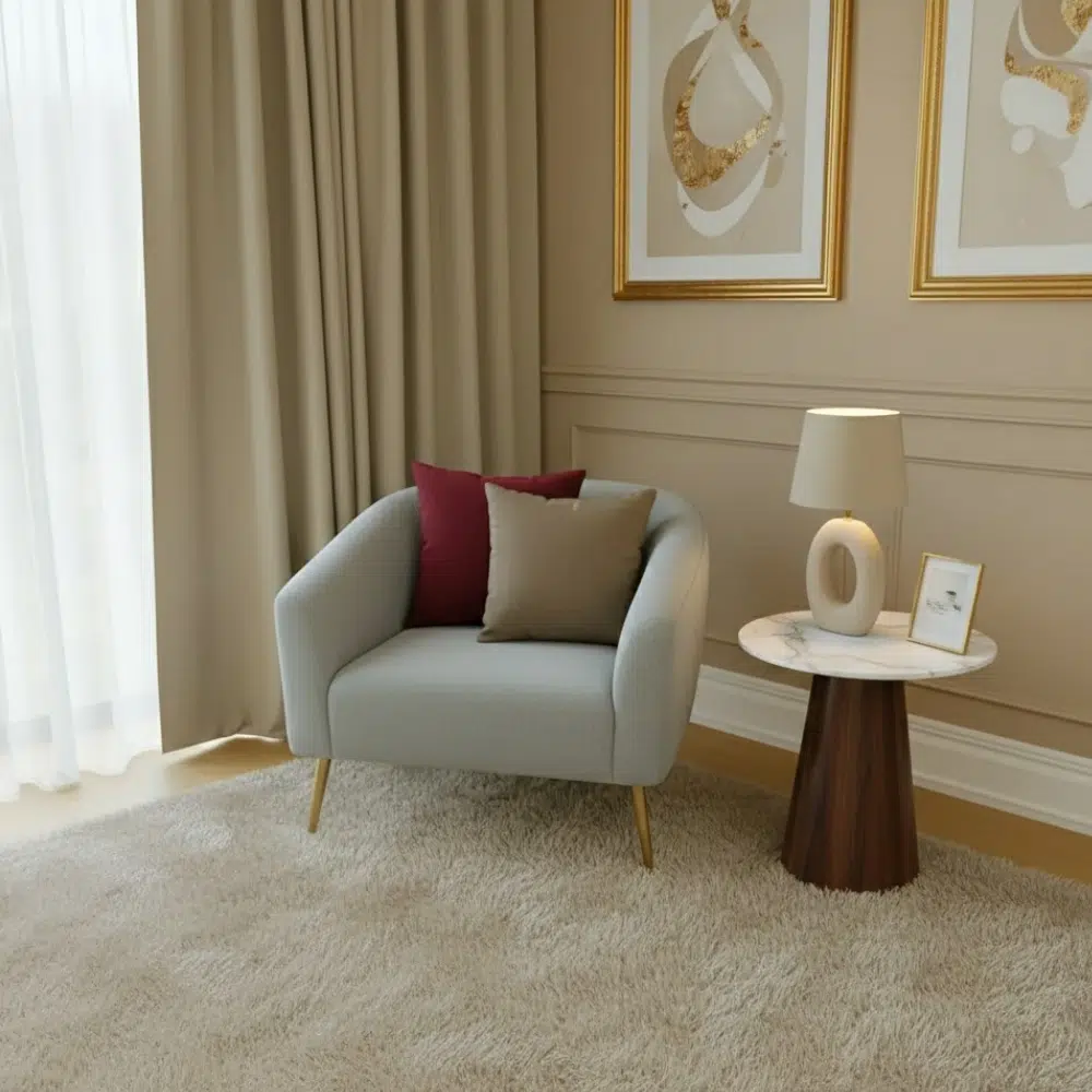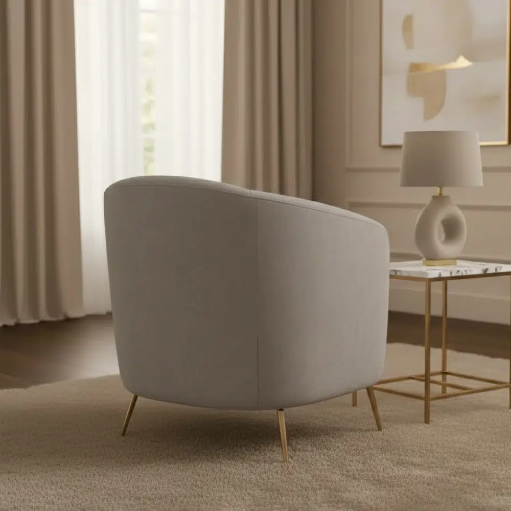 The Modern Curved Fabric Armchair is crafted for homeowners who value elegant design, soft comfort, and a refined contemporary aesthetic. Its smooth rounded edges and wraparound silhouette create a warm, inviting seating experience perfect for living rooms, bedrooms, lounges, and reading corners. The light grey fabric upholstery enhances the chair’s clean, modern look, while the gold-finished metal legs introduce a luxurious touch that elevates any UAE home interior.