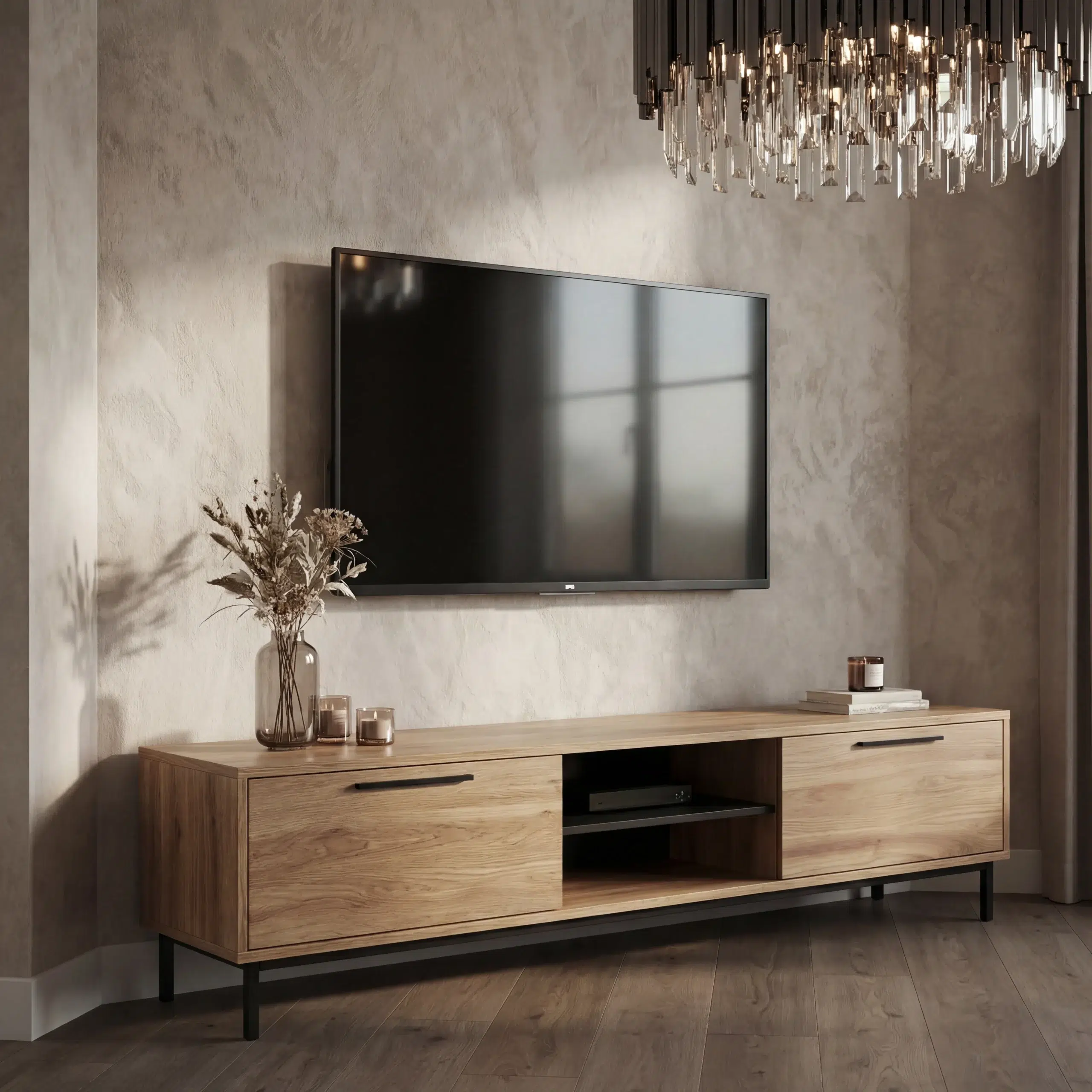 TV Stand: Light oak finish, approx 140m depth , two-door sliding design, black legs