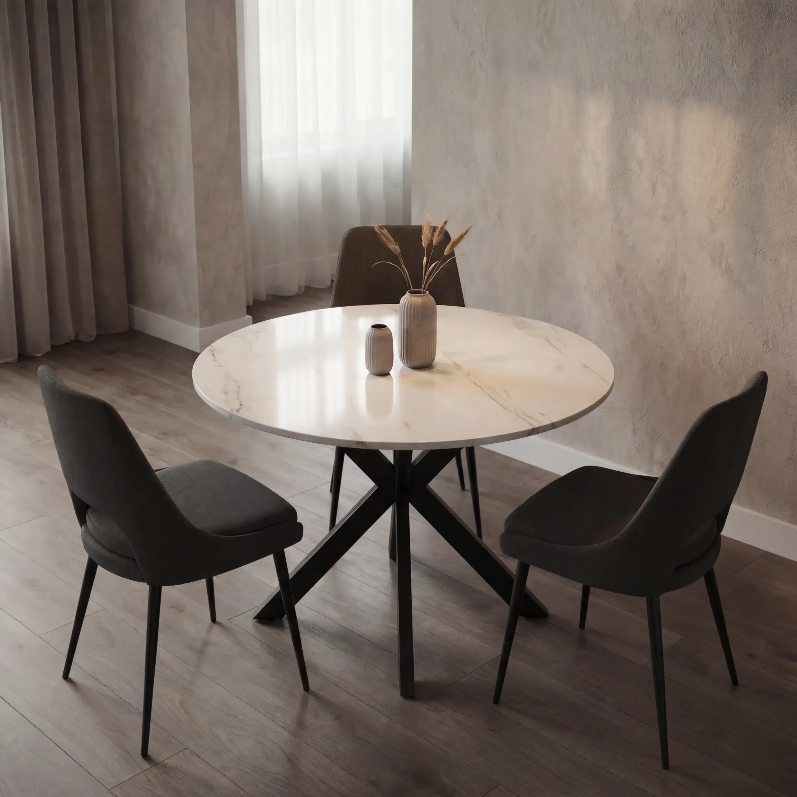 Dining Table (for 4): Round marble‐effect top 120 cmX 75 cm, metal black angled legs