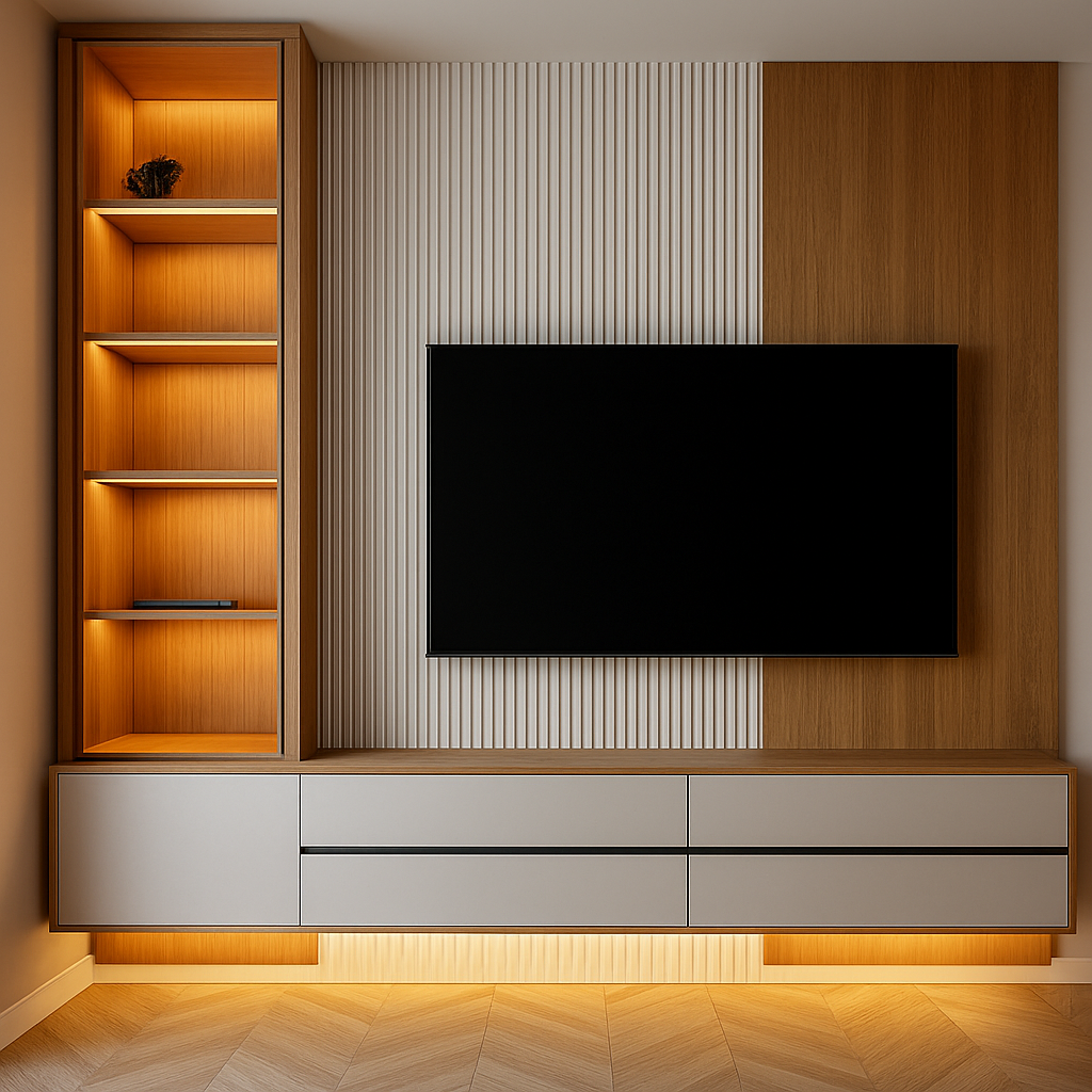 Elevate your living room with this modern LED TV wall unit, featuring a sleek floating console, warm wood accents, textured white slat panels, and integrated ambient lighting. Designed for both style and practicality, it includes spacious drawers for hidden storage and a tall illuminated display shelf that highlights decor beautifully. The under-cabinet LED glow creates a floating effect, adding a luxurious, contemporary touch ideal for modern homes. Perfect for enhancing any entertainment space with elegance, functionality, and cinematic ambiance.