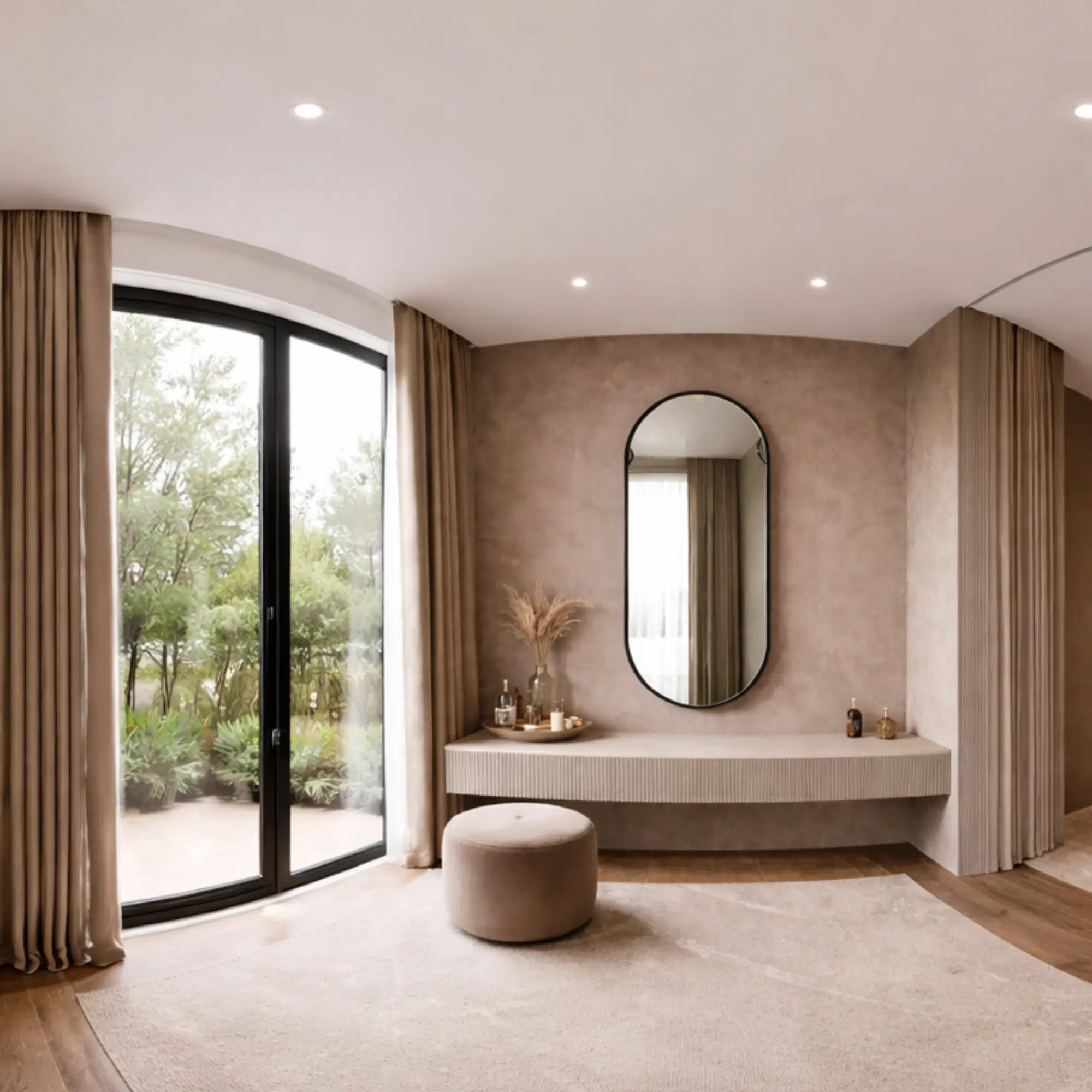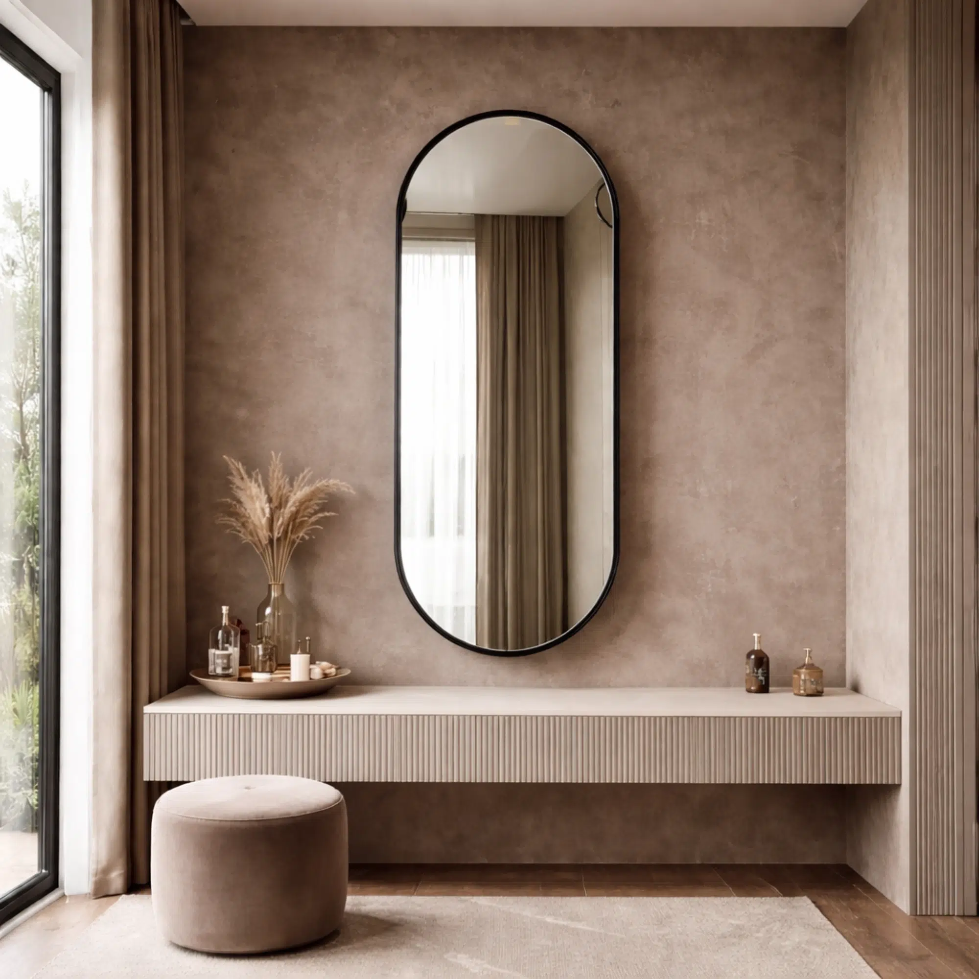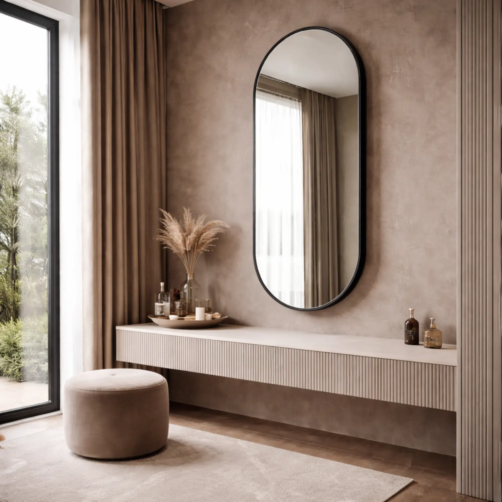 Meanwhile, the tall and narrow form helps walls appear higher. Moreover, the mirror integrates smoothly with modern vanities and neutral interiors. Consequently, its simple design suits minimalist and contemporary décor styles. As a result, the mirror works as both a functional feature and a design element.