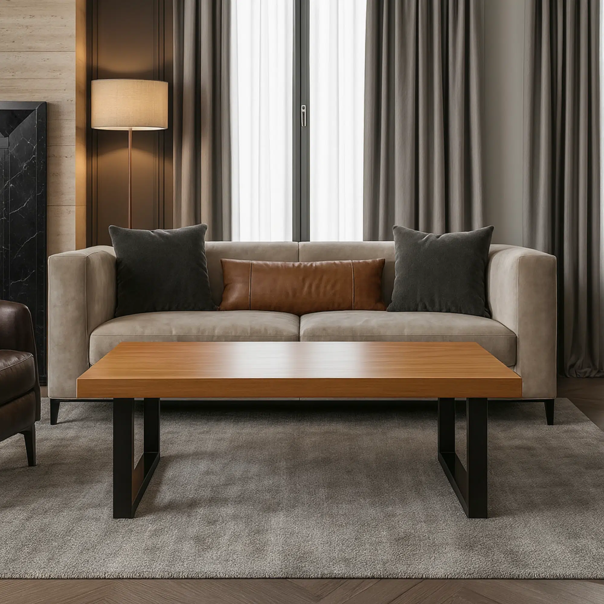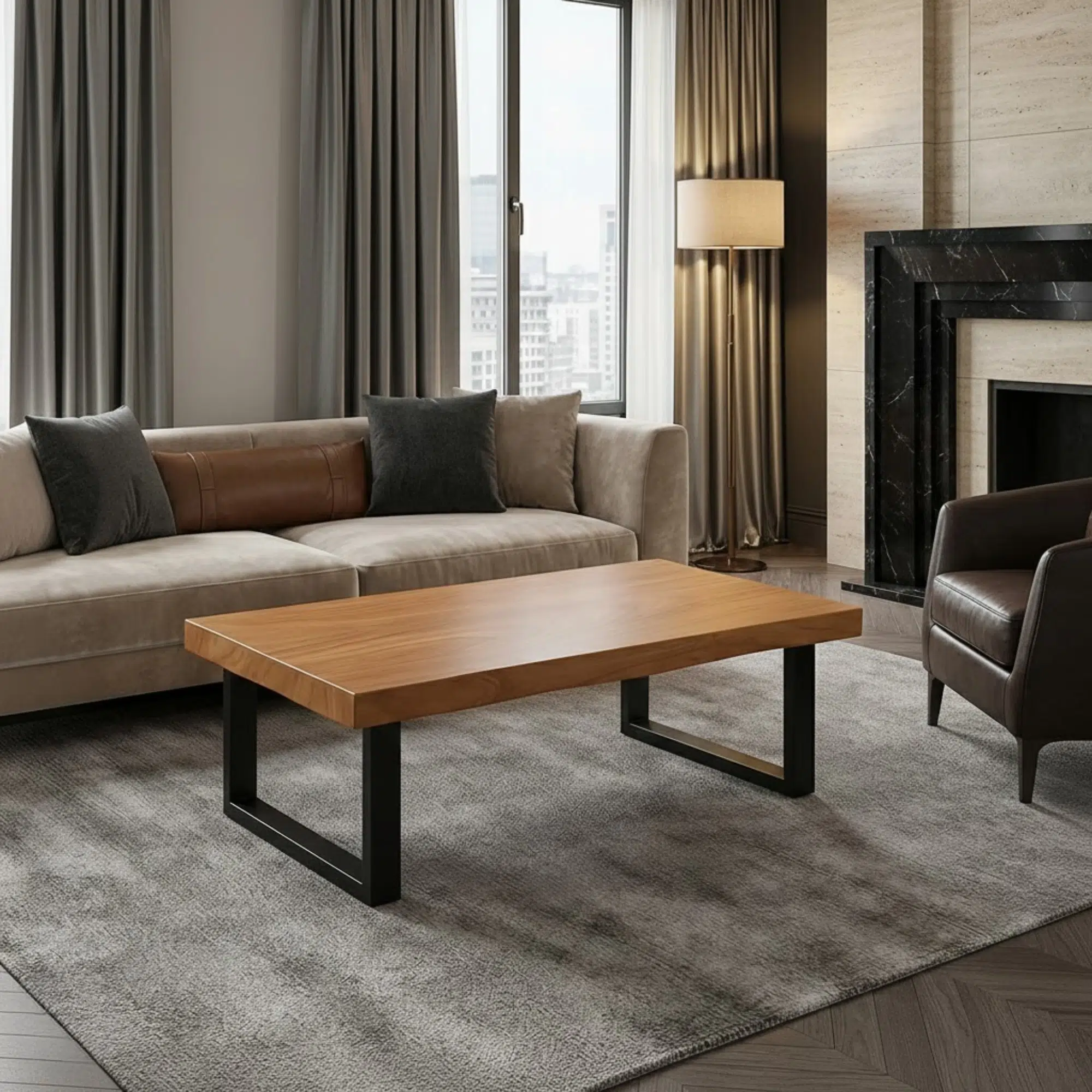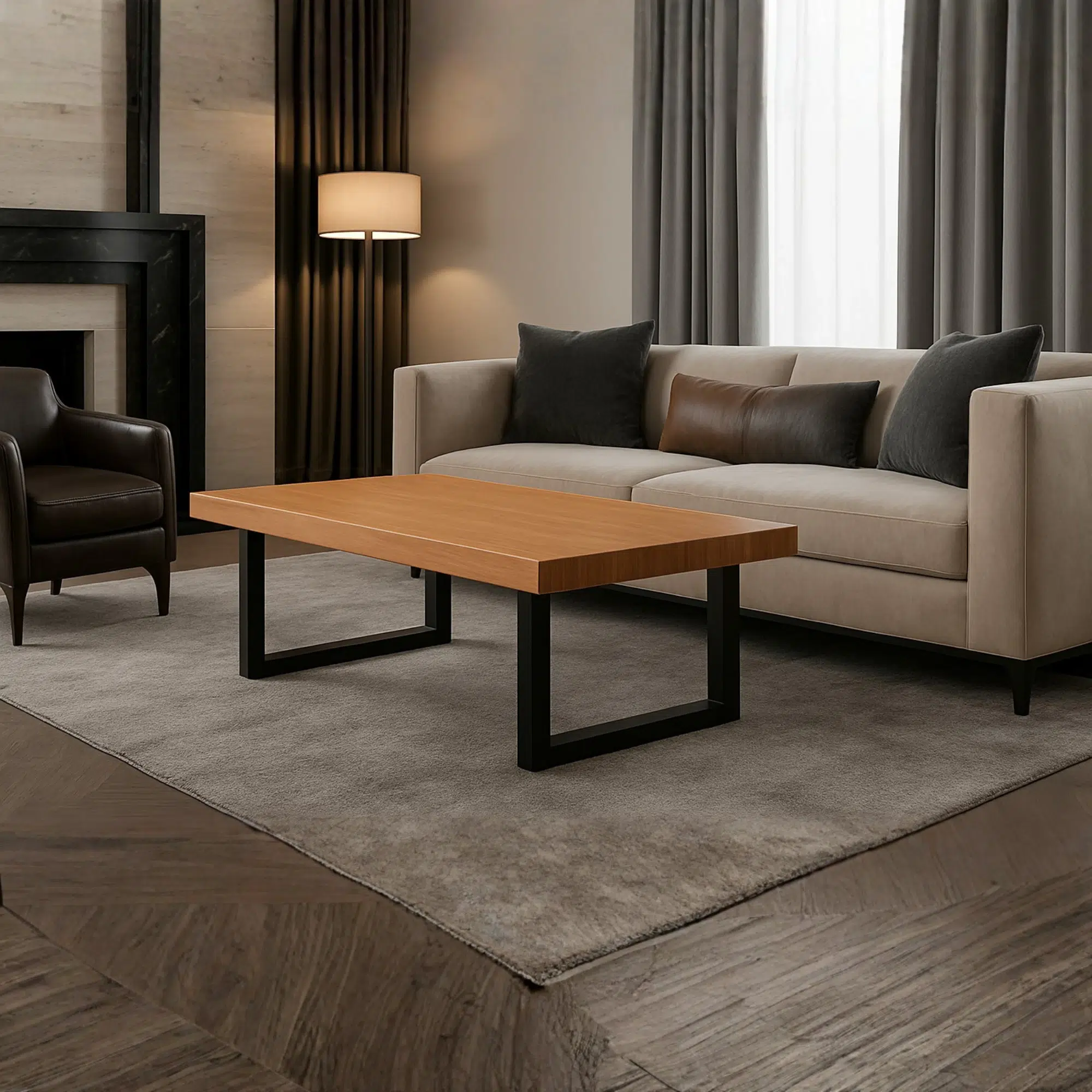 Moreover, the natural wood finish adds timeless appeal, while the black metal legs introduce a subtle industrial touch. However, the design remains simple and easy to style. In addition, the surface is easy to clean, making it suitable for everyday UAE lifestyles. Overall, this centre table anchors your living room with durability, warmth, and refined simplicity.