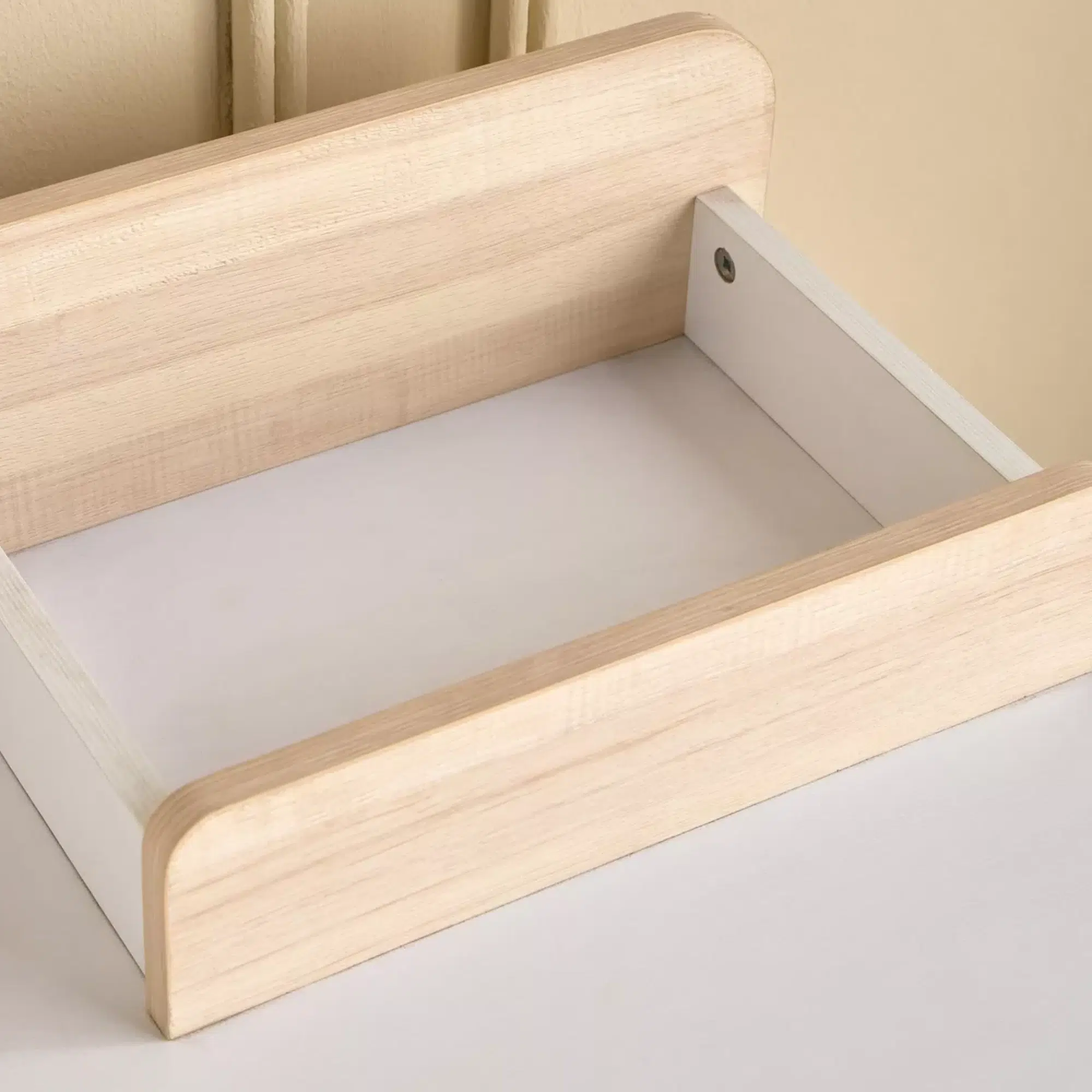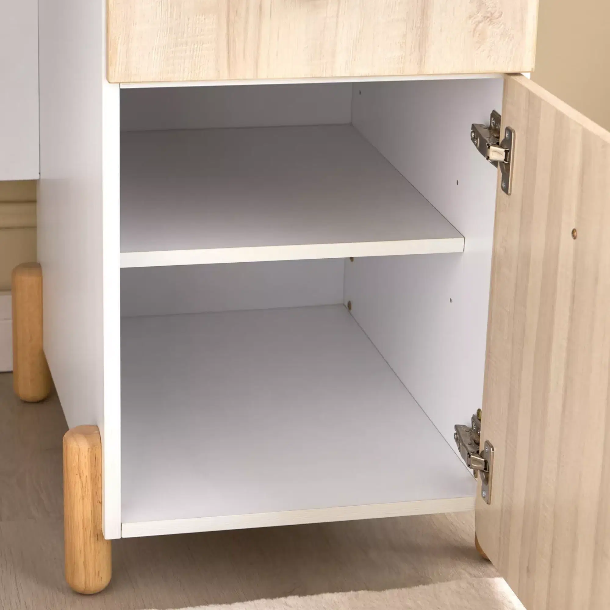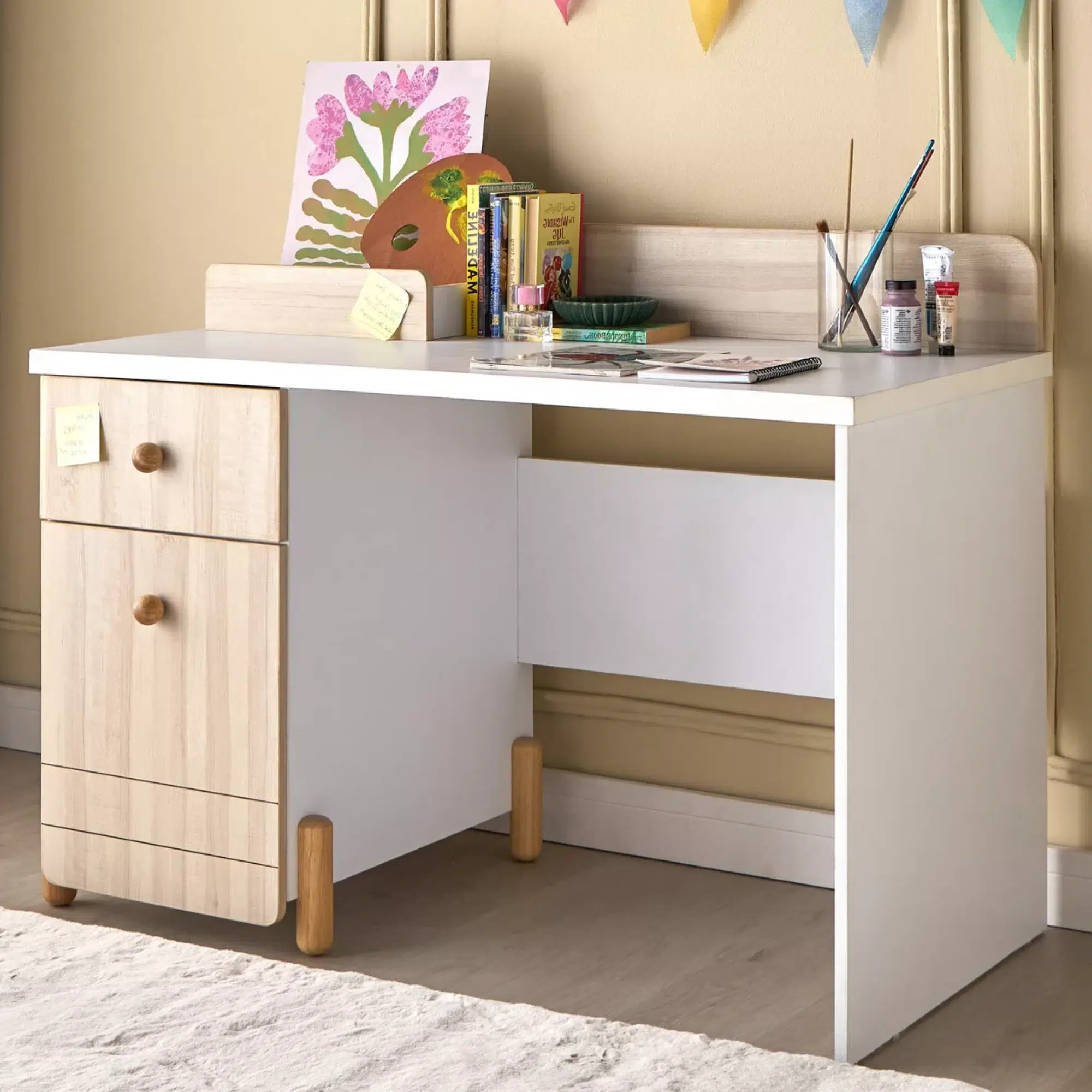 Moreover, the desk features a modern profile supported by sleek legs that keep the design simple and tidy. This structure provides stable support while maintaining a light appearance suitable for children’s furniture. The antique-style handles add a subtle decorative detail that complements the smooth painted surface.