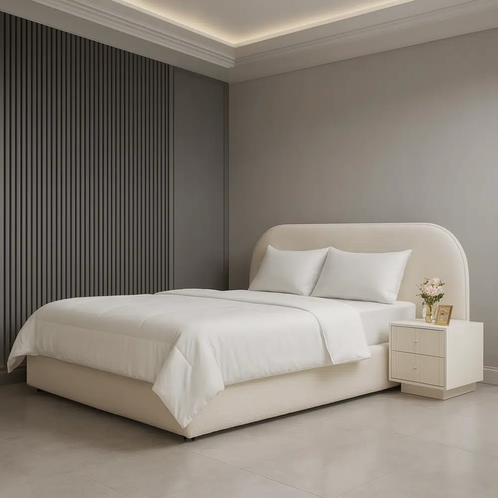 Experience modern elegance with the Oslo Bouclé Curve Bed a beautifully rounded, fully upholstered design crafted for luxury UAE homes. Wrapped in premium bouclé fabric, this bed offers a soft, cozy and elegant aesthetic that suits Dubai-style minimal and contemporary bedrooms. The curved headboard delivers exceptional comfort, while the seamless platform base creates a clean, hotel-inspired look. With 100+ custom fabric and colour options, you can personalise this bed to perfectly match your interior style.