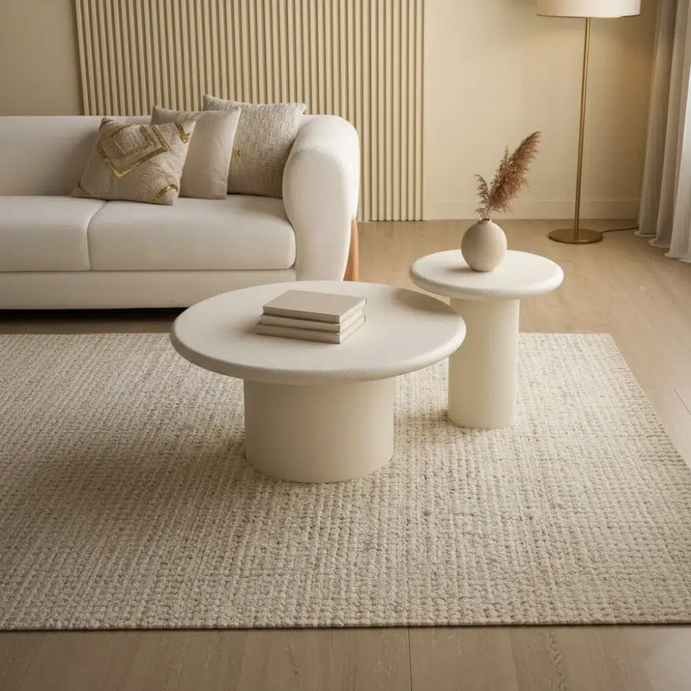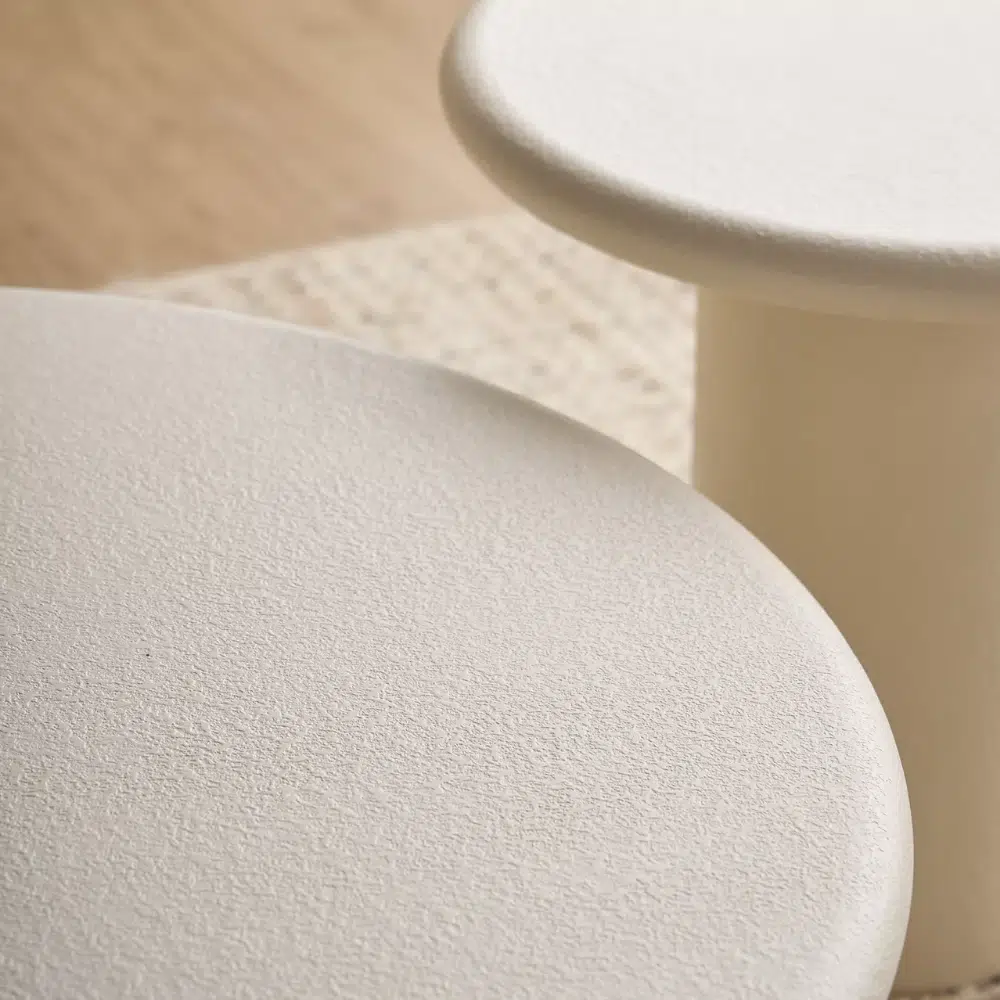 Each table is crafted with a premium plaster-texture finish, offering a soft matte feel that enhances neutral and minimalist interiors. The sturdy cylindrical pedestal bases add architectural presence while ensuring long-term stability. With the larger table measuring 80 cm wide and the smaller 45 cm, the set provides multiple styling options — use them together, apart, or as accent surfaces around the room.