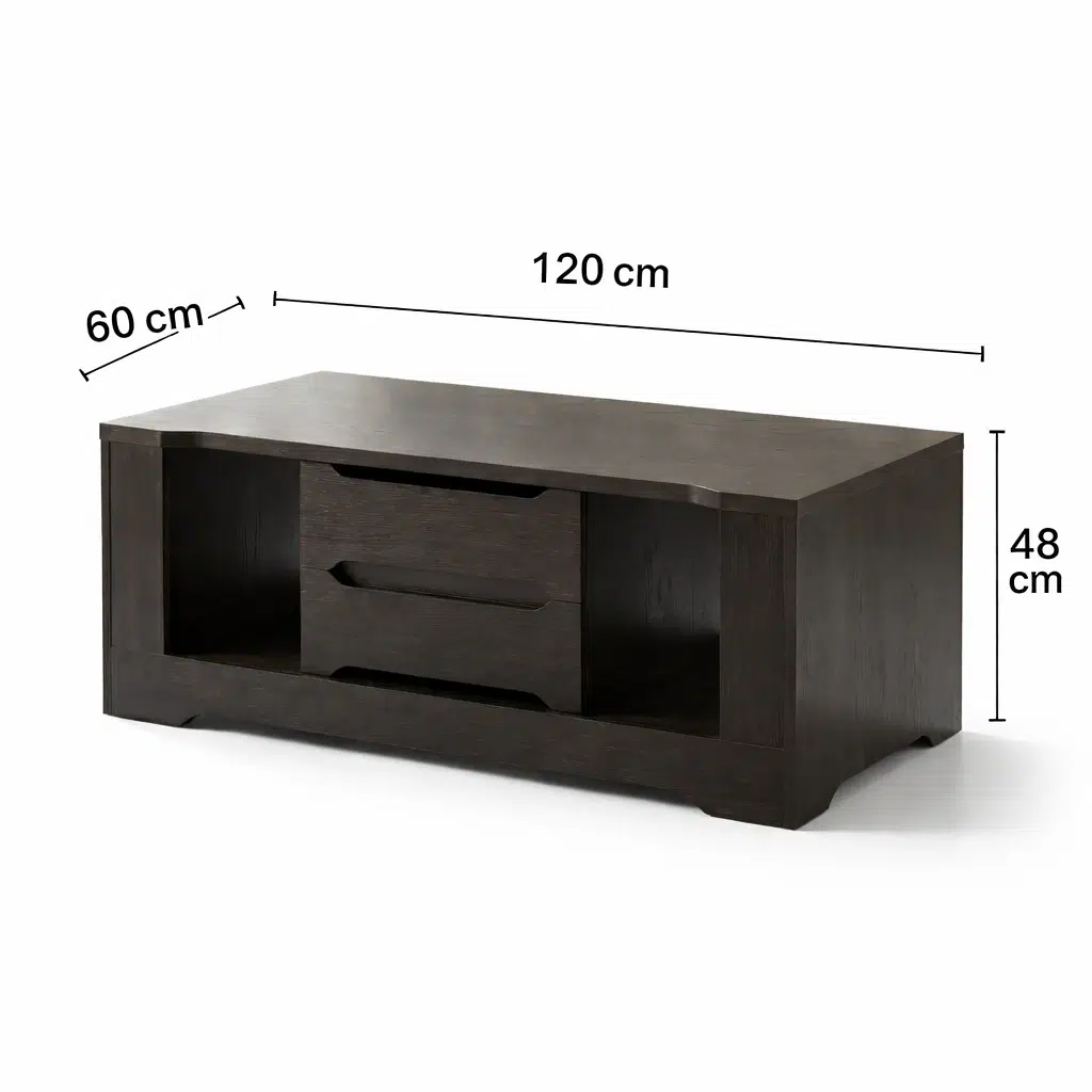 Crafted from durable MDF, the Quorum modern centre table is built for long-lasting performance. Furthermore, the solid construction supports everyday routines. The table includes two smooth drawers for concealed storage. Meanwhile, the two open shelves provide easy access to books or decorative pieces.