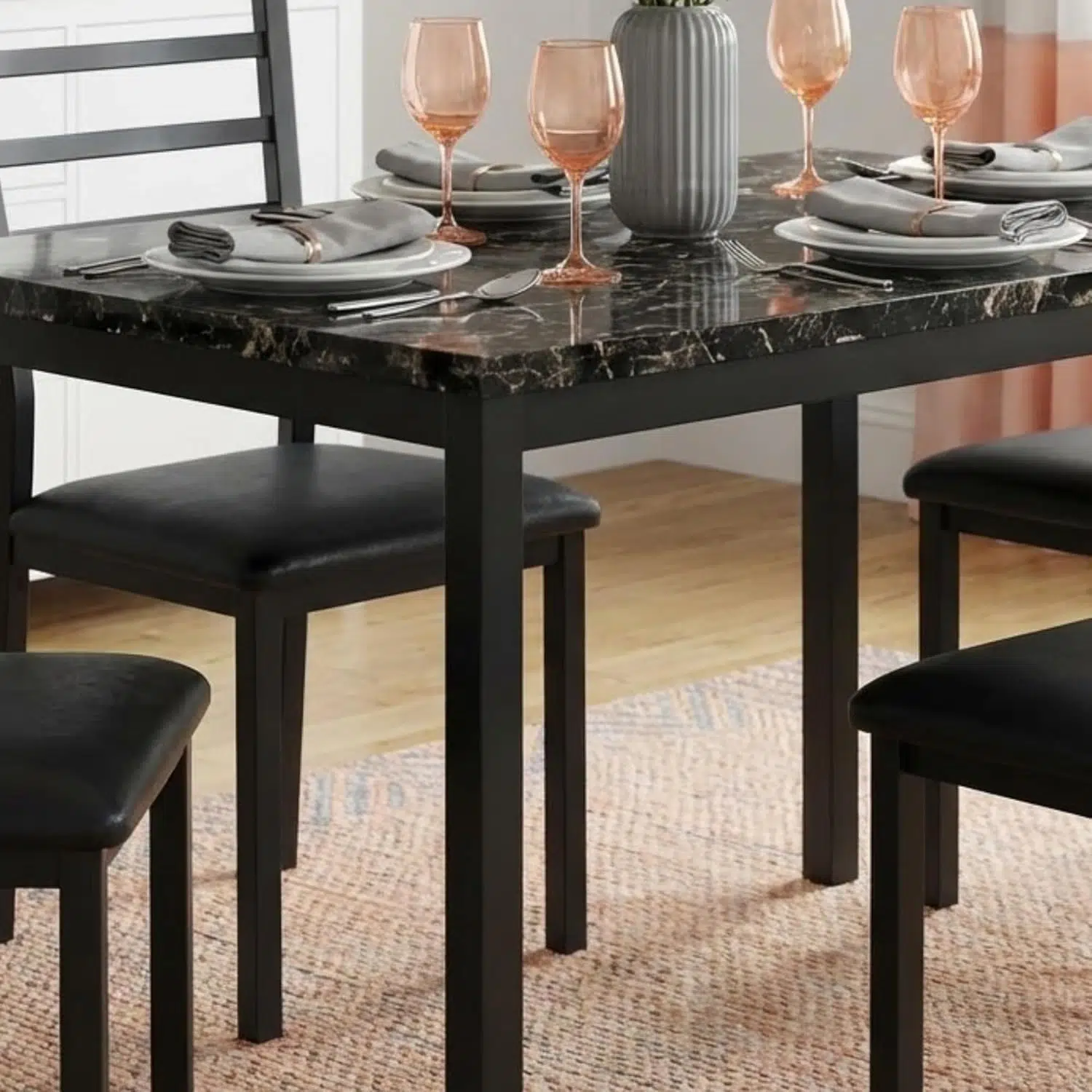Additionally, the table features a marble glass tabletop supported by a strong steel frame. Because of this construction, the dining table remains stable during daily use. Meanwhile, the rectangular shape allows the set to fit easily in dining rooms, kitchens, and open-plan living spaces.