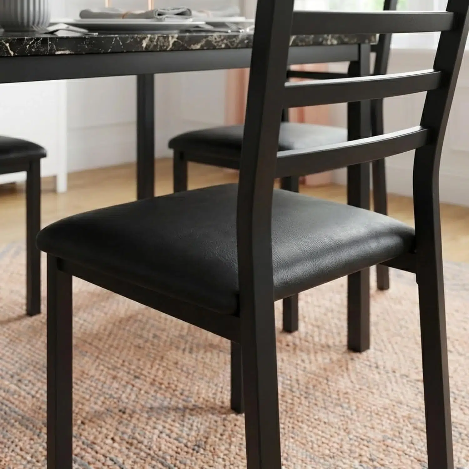 Moreover, the dining set includes four matching chairs designed for daily comfort. The chairs provide reliable support during meals. At the same time, their simple design keeps the dining area looking neat and modern. Therefore, the set works well for small families and compact dining spaces.
