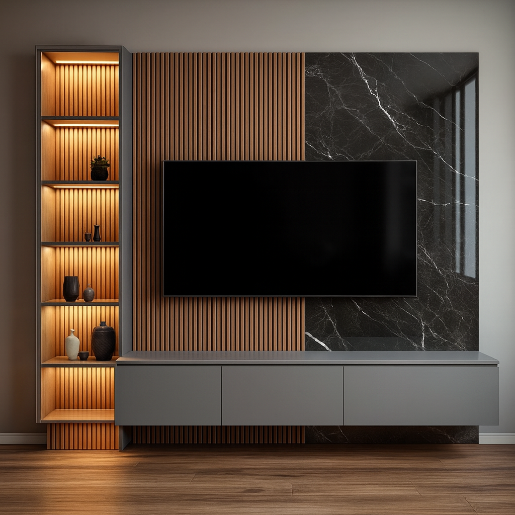 Transform your living room into a modern showpiece with this premium TV Entertainment Unit featuring Shelves and LED Lighting. Designed to elevate both style and functionality, this striking unit includes a sleek, low-profile TV console that appears to float effortlessly, paired with a dynamic back panel crafted from warm vertical MDF wood slats and luxurious dark marble-effect accents. Perfect for mounting your flat-screen TV, it creates a stunning focal point in any contemporary home.