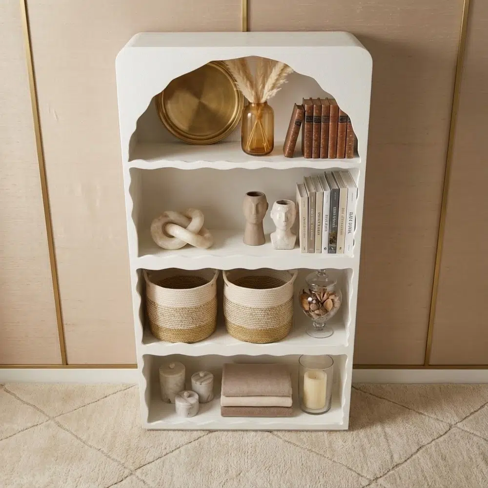 Crafted from durable engineered wood and finished in a matte plaster texture, the Sahara Curve Display Unit feels like a luxury built-in piece while remaining lightweight and easy to maintain. Whether placed in a living room, bedroom, hallway, or home office, its warm neutral tone blends seamlessly into Scandinavian, modern, minimalist, and coastal-inspired interiors.