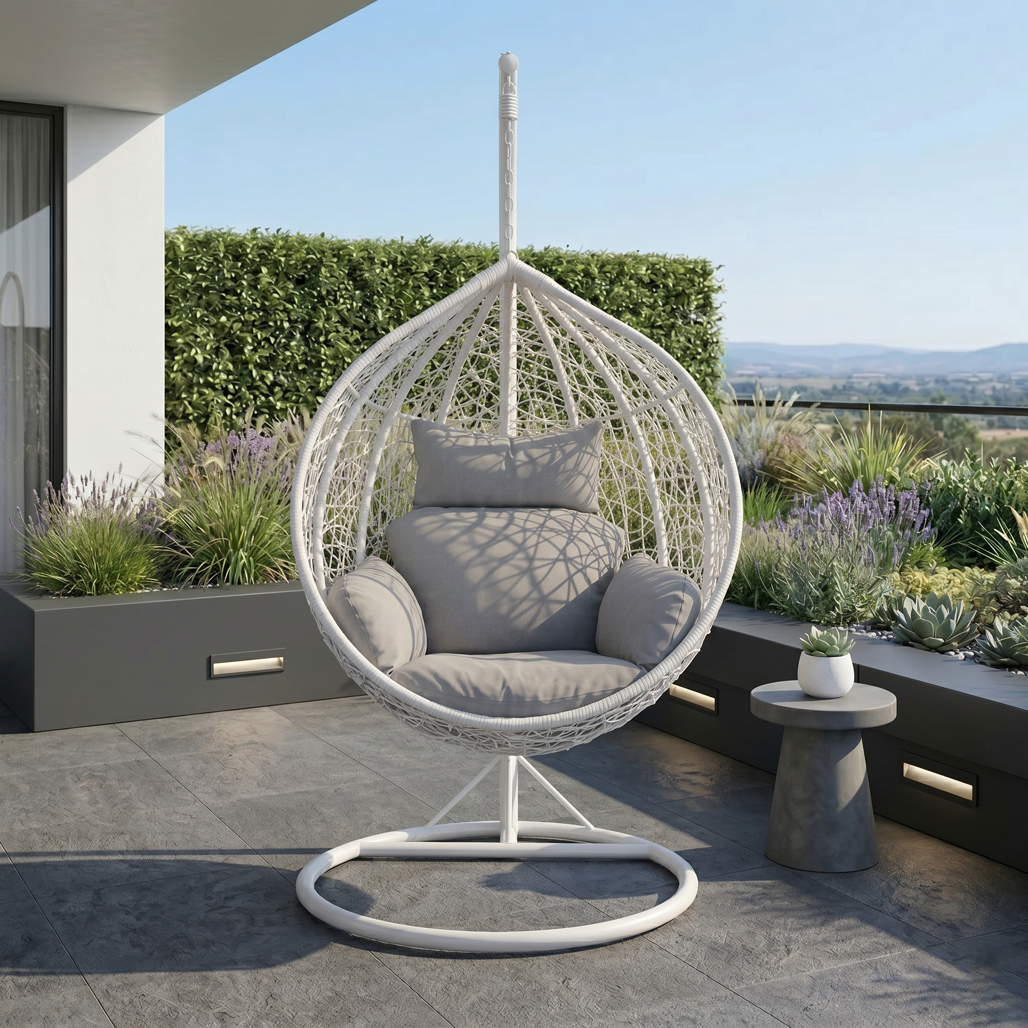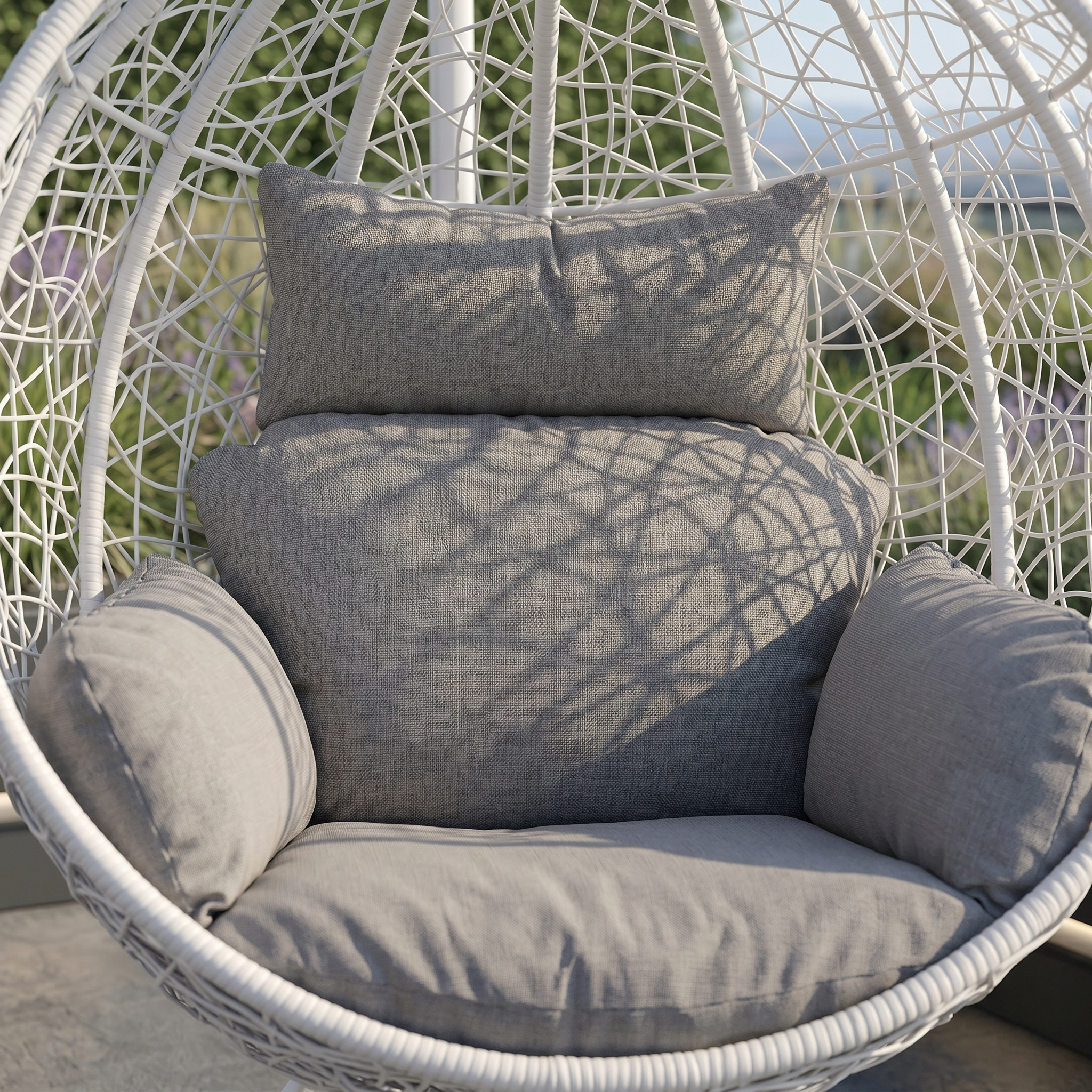 Additionally, the chair includes soft cushions that provide support during extended use. The breathable filling enhances comfort while maintaining shape over time. Meanwhile, the sturdy stand allows the chair to hang securely, offering a gentle swinging motion for relaxation. The White wicker-style finish complements natural and modern surroundings alike.