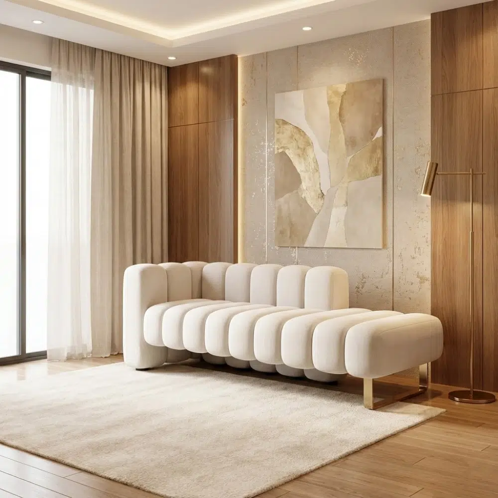 The Sofyn Chaise Lounge is a sculptural luxury seating piece designed for high-end interiors across Dubai, Abu Dhabi, and the UAE. Featuring a bold contemporary silhouette with plush segmented cushioning, this chaise lounge delivers a perfect balance of designer aesthetics, comfort, and modern elegance.