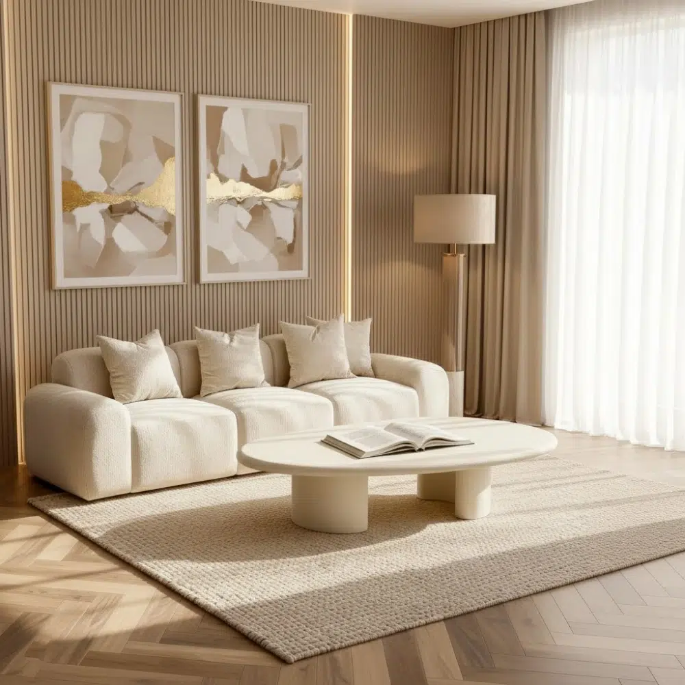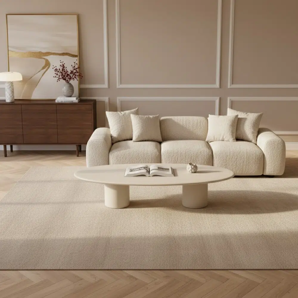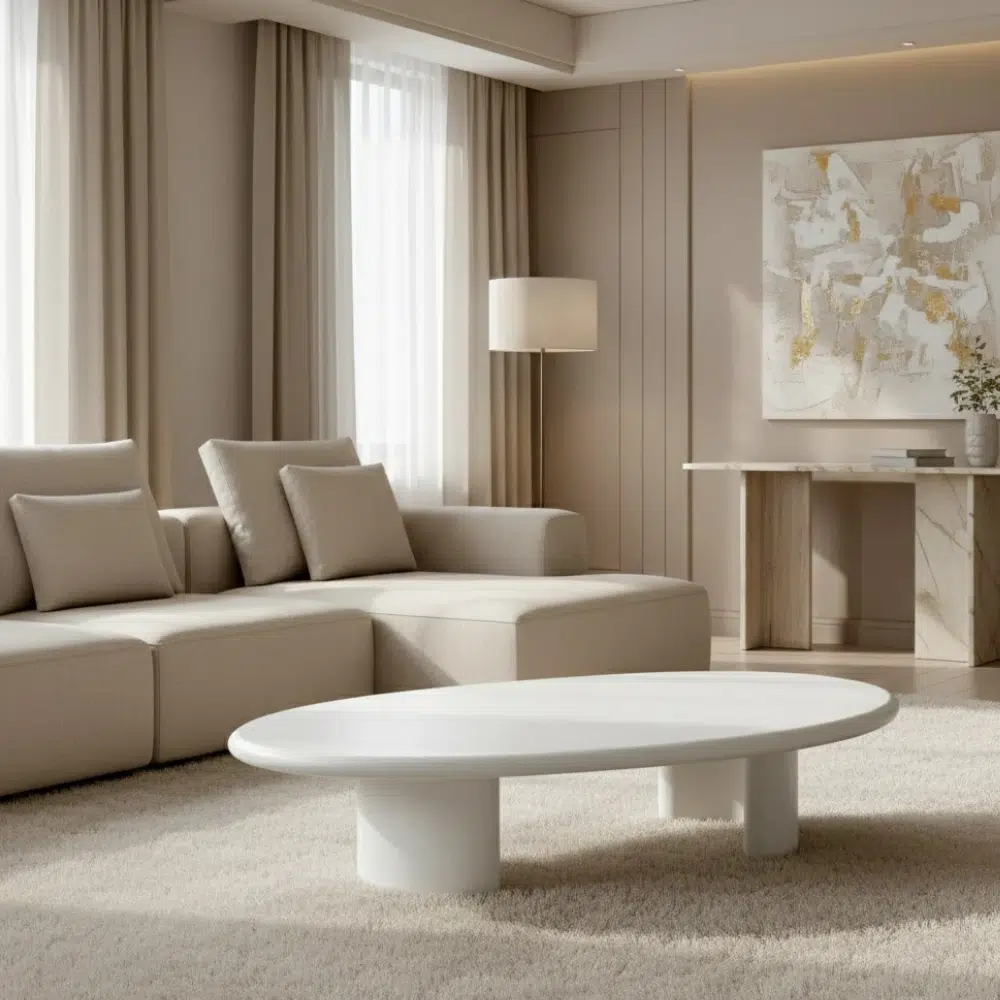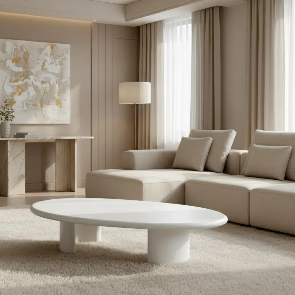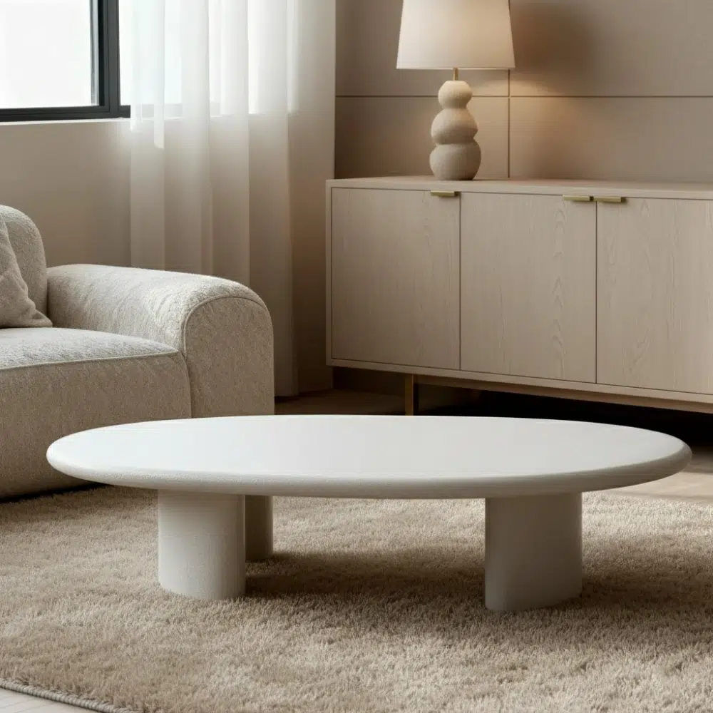 The Solaro Oval Luxe Coffee Table brings effortless elegance and sculptural simplicity into modern UAE homes. Designed for spaces that embrace minimalism and quiet luxury, this low-profile oval table features a smooth plaster-textured top supported by three rounded pedestal legs, creating a refined statement piece that feels both contemporary and timeless.