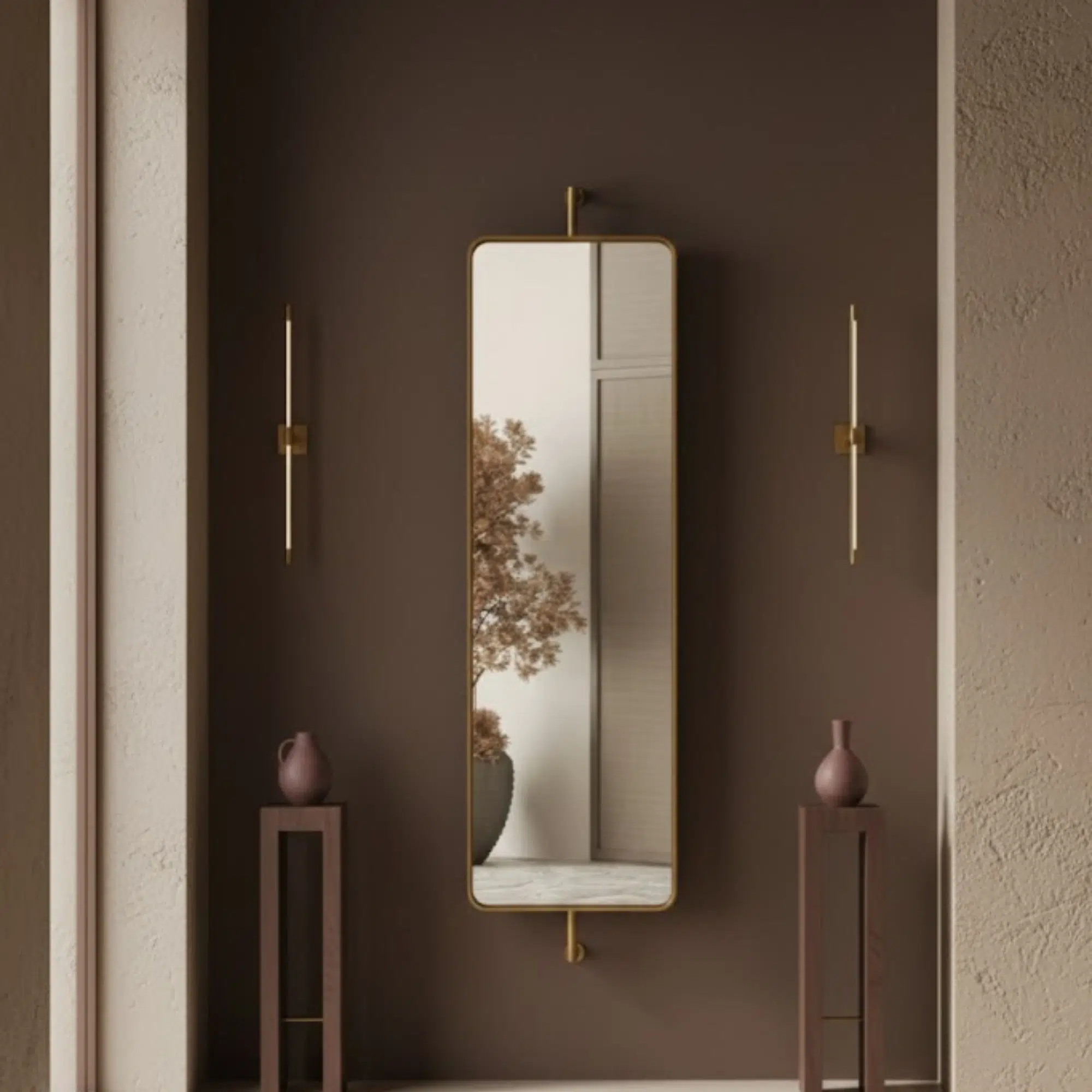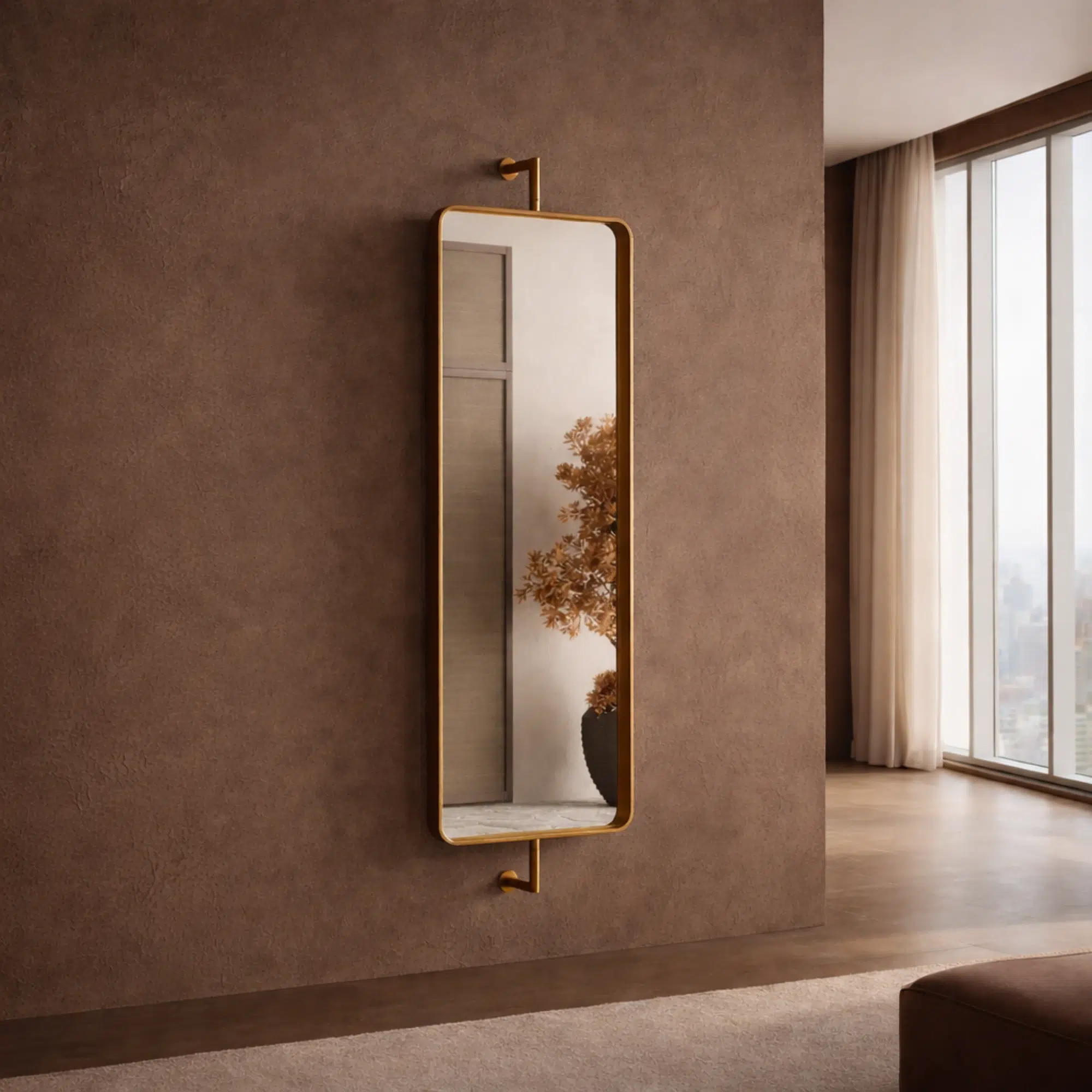 The Swivel Wall Hanging Mirror suits modern homes that need both style and ease. Firstly, its long rectangular shape adds height and balance to the room. Moreover, the slim gold frame brings warmth and a clean look. At the same time, the mirror reflects light softly, so spaces feel brighter and more open.