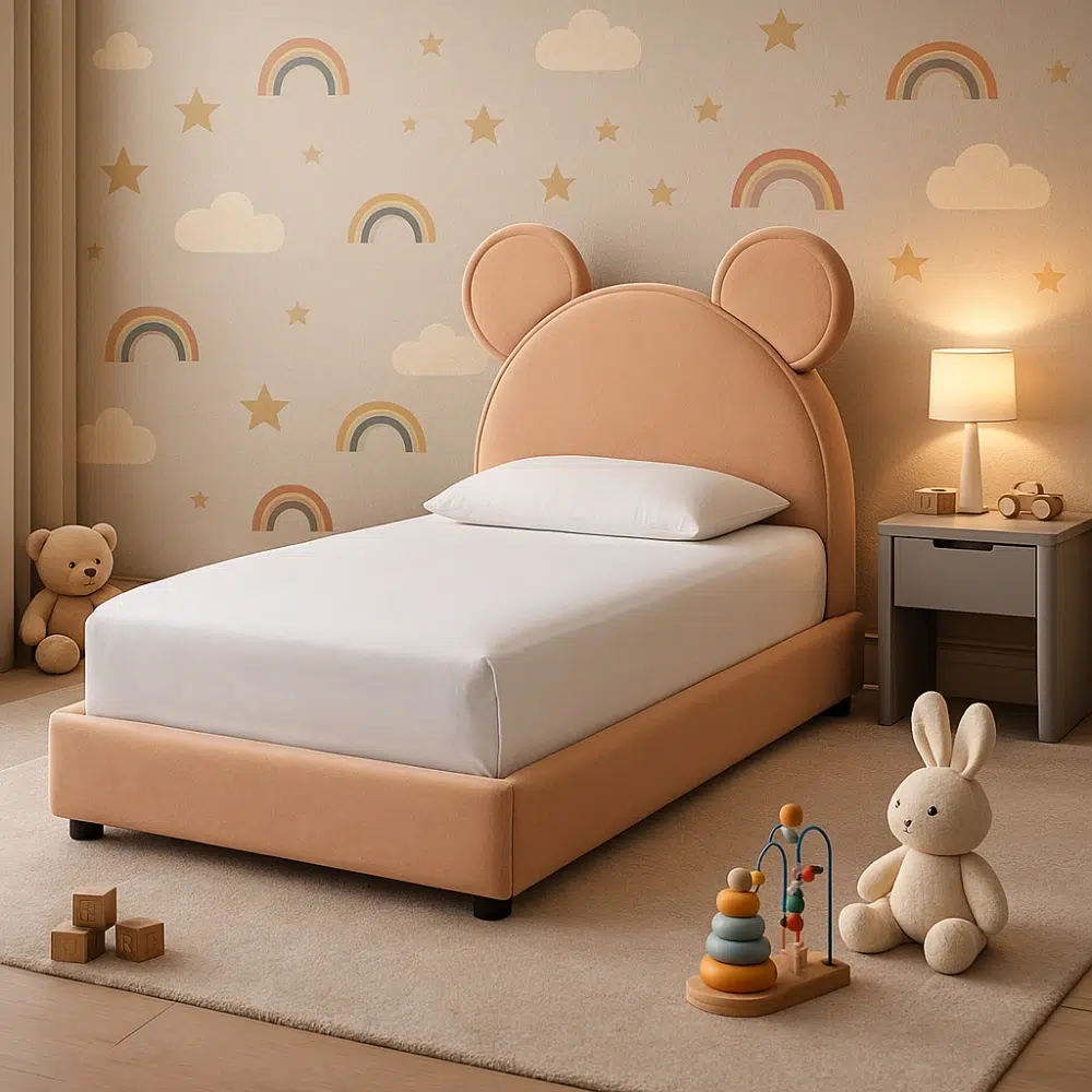Bring warmth, imagination and playful style into your child’s bedroom with the Teddy Bear Velvet Kids Bed. Its cute bear-ear headboard makes it instantly lovable, while the soft velvet fabric provides a cozy and gentle feel—perfect for bedtime snuggles. The bed is designed with safety in mind: rounded edges, padded sides and a low height make it child-friendly and easy to access. Ideal for both boys’ and girls’ rooms, the Teddy Bed blends perfectly with modern, cute or themed interiors commonly seen in UAE homes. Built with high-quality materials, it offers long-lasting durability and everyday comfort.